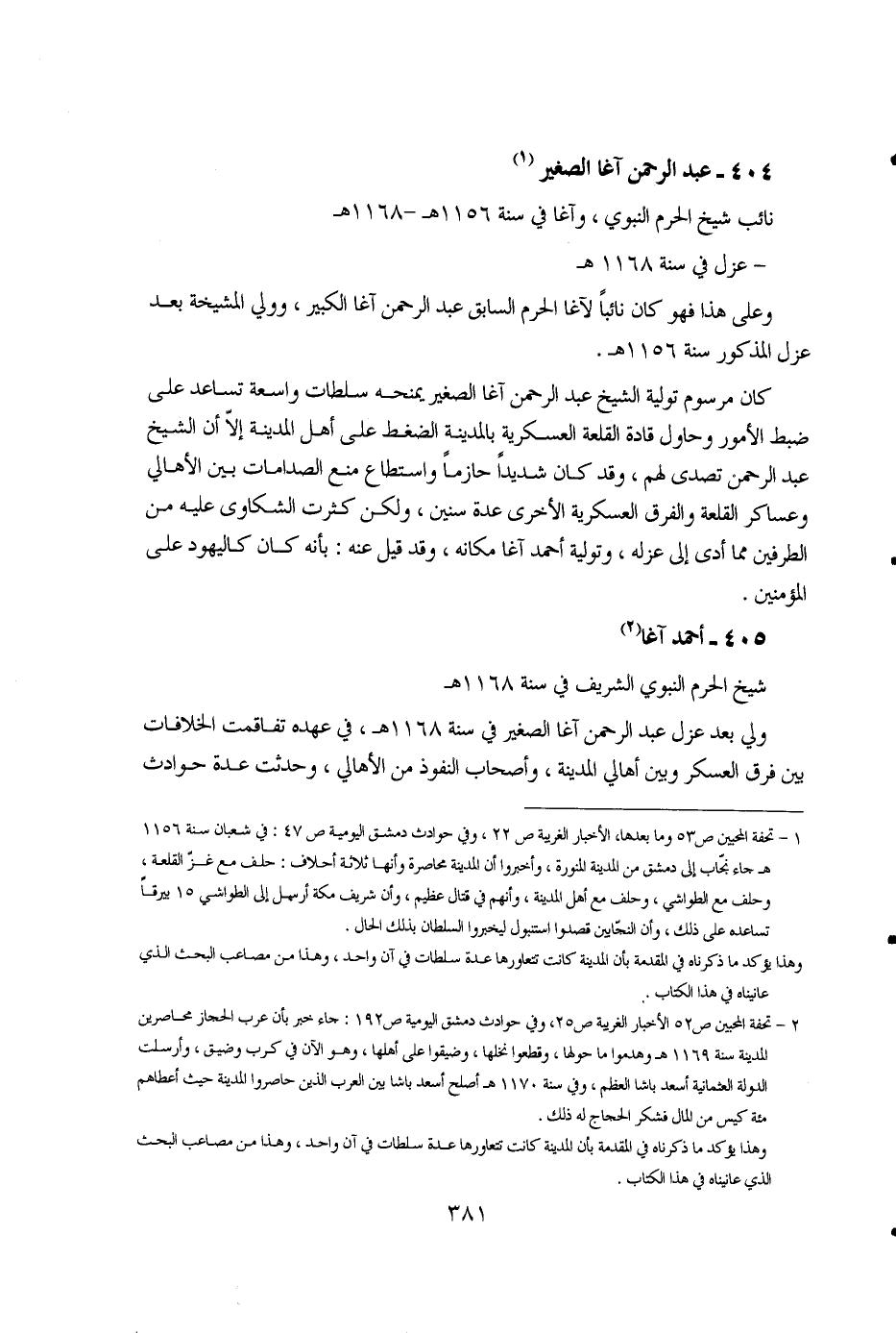 1 - تحفة المحبين ص53 وما بعدها، الأخبار الغريبة ص22، وفي حوادث دمشق اليومية ص47: في شعبان سنة 1156 هـ جاء نجاب إلى دمشق من المدينة المنورة، وأخبروا أن المدينة محاصرة وأنها ثلاثة أحلاف: حلف مع غز القلعة، وحلف مع الطواشي، وحلف مع أهل المدينة، وأنهم في قتال عظيم، وأن شريف مكة أرسل إلى الطواشي 15 بيرقاً تساعده على ذلك، وأن النجابين قصدوا استنبول ليخبروا السلطان بذلك الحال. وهذا يؤكد ما ذكرناه في المقدمة بأن المدينة كانت تتعاورها عدة سلطات في آن واحد، وهذا من مصاعب البحث الذي عانيناه في هذا الكتاب. 2 - تحفة المحبين ص52 الأخبار الغريبة ص25، وفي حوادث دمشق اليومية ص192: جاء خبر بأن عرب الحجاز محاصرين المدينة سنة 1169هـ وهدموا ما حولها، وقطعوا نخلها، وضيقوا على أهلها، وهو الآن في كرب وضيق، وأرسلت الدولة العثمانية أسعد باشا العظم، وفي سنة 1170هـ أصلح أسعد باشا بين العرب الذين حاصروا المدينة حيث اعطاهم مئة كيس من المال فشكر الحجاج له ذلك. وهذا يؤكد ما ذكرناه في المقدمة بأن المدينة كانت تتعاورها عدة سلطات في آن واحد، وهذا من مصاعب البحث الذي عانيناه في هذا الكتاب.