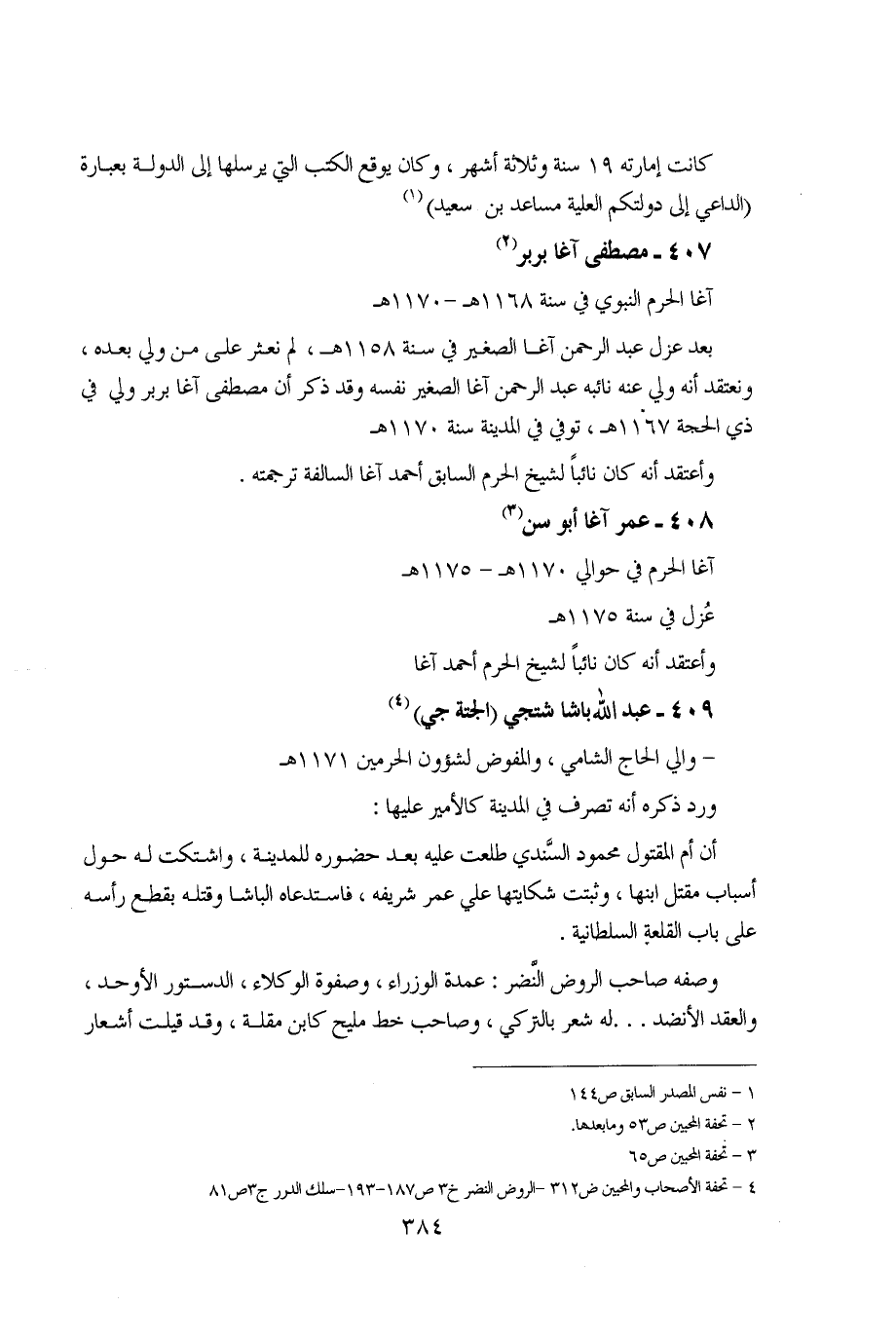 1 - نفس المصدر السابقة ص144 2 - تحفة المحبين ص53 وما بعدها 3 - تحفة المحبين ص65 4 - تحفة الأصحاب والمحبين ص312 - الروض النضر ج3 ص187 - 193 سلك الدرر ج3 ص81.