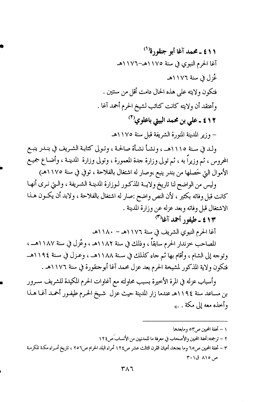 -وزير المدينة المنورة الشريفة قبل سنة 1175هـ ولد في سنة 1115هـ، ونشأ نشأة صالحة، وتولى كتابة الشريف في بندر ينبع المحروس، ثم وزيراً به، ثم تولى وزارة جدة المعمورة، وتولى وزارة المدينة، وأضاع جميع الأموال التي حصلها من بندر ينبع، وصار له اشتغال بالفلاحة، توفي في سنة1175هـ) وليس من الواضح لنا تاريخ ولاية المذكور لوزارة المدينة الشريفة، والتي نرى أنها كانت قبل وفاته بكثير، لأن النص واضح: صار له اشتغال بالفلاحة، ولا بد أن يكون هذا الاشتغال قبل وفاته وبعد عزله عن وزارة المدينة.