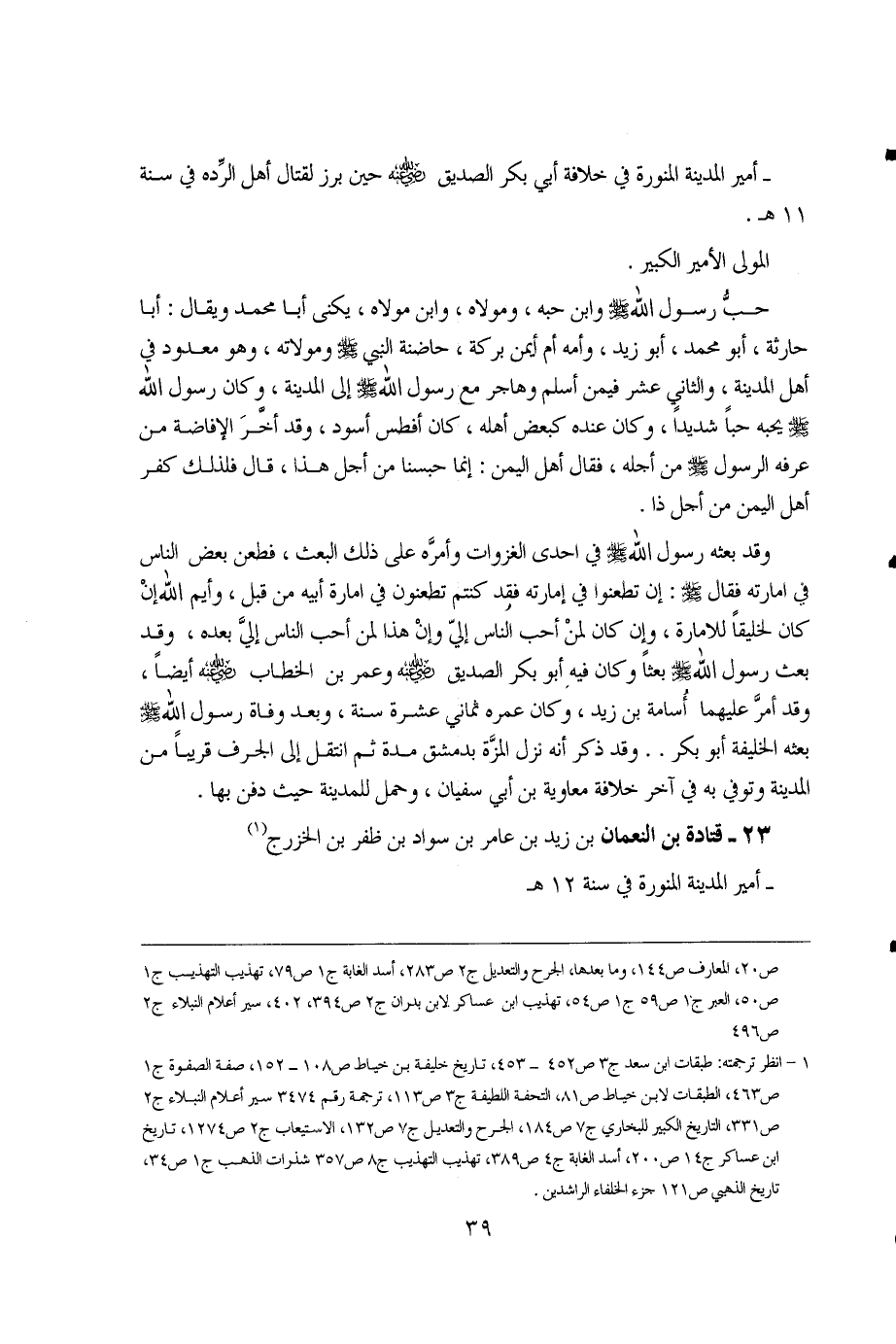 1 - انظر ترجمته: طبقات ابن سعد ج3 ص452 - 453، تاريخ خليفة بن خياط ص108 - 152، صفة الصفوة ج1 ص463، الطبقات لابن خياط ص81، التحفة اللطيفة ج3 ص113، ترجمة رقم 3474 سير أعلام النبلاء ج2 ص331، التاريخ الكبير للبخاري ج7 ص184، الجرح والتعديل ج7 ص132، الاستيعاب ج2 ص1274، تاريخ ابن عساكر ج14 ص 200، أسد الغابة ج4 ص389، تهذيب التهذيب ج8 ص357 شذرات الذهب ج1 ص34، تاريخ الذهبي ص121 جزء الخلفاء الراشدين.