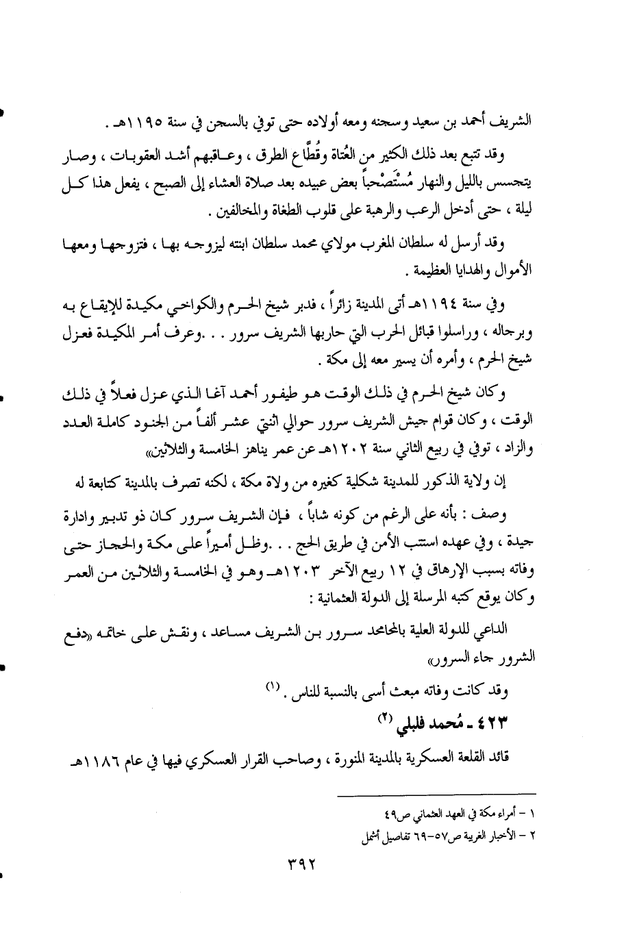 392 ... الشريف أحمد بن سعيد وسجنه ومعه أولاده حتى توفي بالسجن في سنة 1195هـ. وقد تتبع بعد ذلك الكثير من العتاة وقطاع الطرق، وعاقبهم أشد العقوبات، وصار يتجسس بالليل والنهار مستصحباً بعض عبيده بعد صلاة العشاء إلى الصبح، يفعل هذا كل ليلة، حتى أدخل الرعب والرهبة على قلوب الطغاة والمخالفين. وقد أرسل له سلطان المغرب مولاي محمد سلطان ابنته ليزوجه بها، فتزوجها ومعها الأموال والهدايا العظيمة. وفي سنة 1194هـ أتى المدينة زائراً، فدبر شيخ الحرم والكواخي مكيدة للإيقاع به وبرجاله، وراسلوا قبائل الحرب التي حاربها الشريف سرور… وعرف أمر المكيدة فعزل شيخ الحرم، وأمره أن يسير معه إلى مكة. وكان شيخ الحرم في ذلك الوقت هو طيفور أحمد آغا الذي عزل فعلاً في ذلك الوقت، وكان قوام جيش الشريف سرور حوالي اثنتي عشر ألفاً من الجنود كاملة العدد والزاد، توفي في ربيع الثاني سنة 1202هـ عن عمر يناهز الخامسة والثلاثين". إن ولاية المذكور للمدينة شكلية كغيره من ولاة مكة، لكنه تصرف بالمدينة كتابعة له وصف: بأنه على الرغم من كونه شاباً، فإن الشريف سرور كان ذو تدبير وإدارة جيدة، وفي عهده استتب الأمن في طريق الحج… وظل أميراً على مكة والحجاز حتى وفاته بسبب الإرهاق في 12 ربيع الآخر 1203هـ وهو في الخامسة والثلاثين من العمر وكان يوقع كتبه المرسلة إلى الدولة العثمانية: الداعي للدولة العلية بالمحامد سرور بن الشريف مساعد، ونقش على خاتمه "دفع الشرور جاء السرور". وقد كانت وفاته مبعث أسى بالنسبة للناس. (1)
