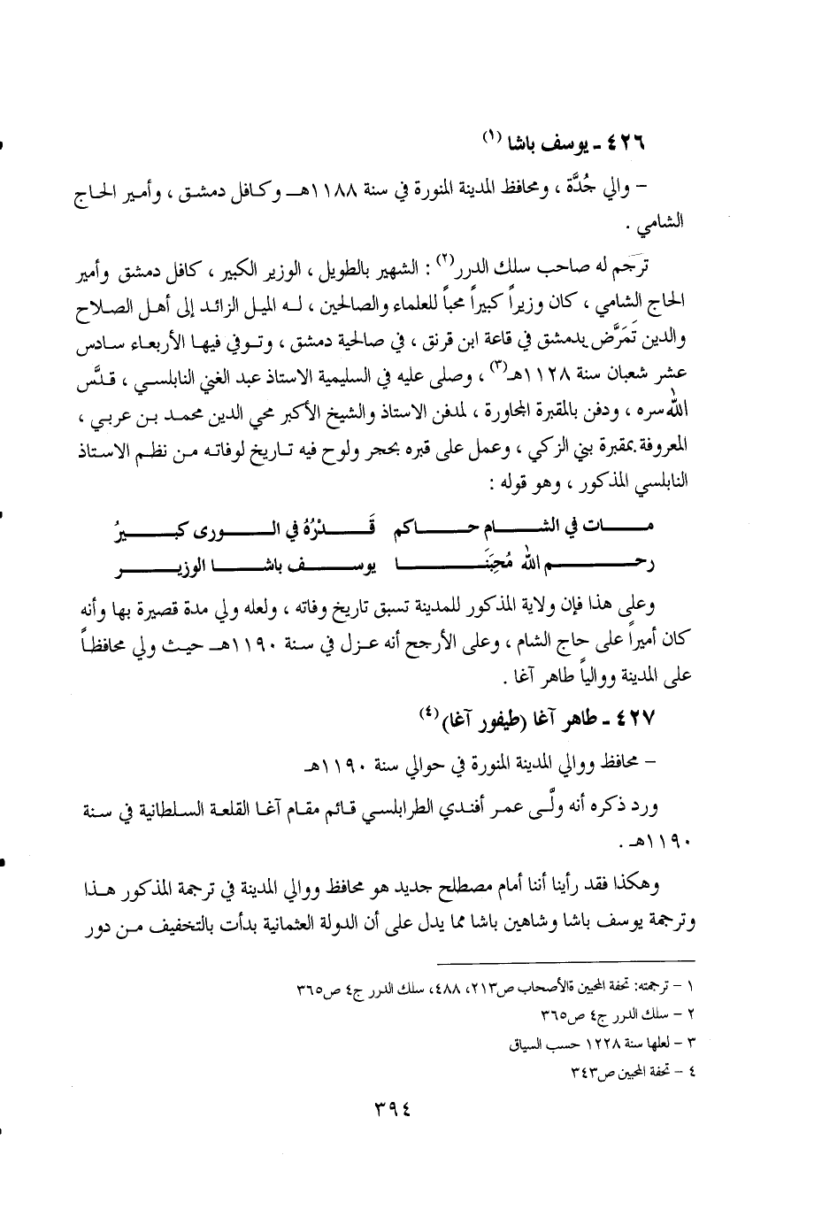- محافظ ووالي المدينة المنورة في حوالي سنة 1190هـ ورد ذكره أنه ولى عمر أفندي الطرابلسي قائم مقام آغا القلعة السلطانية في سنة1190هـ. وهكذا فقد رأينا أننا أمام مصطلح جديد هو محافظ ووالي المدينة في ترجمة المذكور هذا وترجمة يوسف باشا وشاهين باشا مما يدل على أن الدولة العثمانية بدأت بالتخفيف من دور ...
