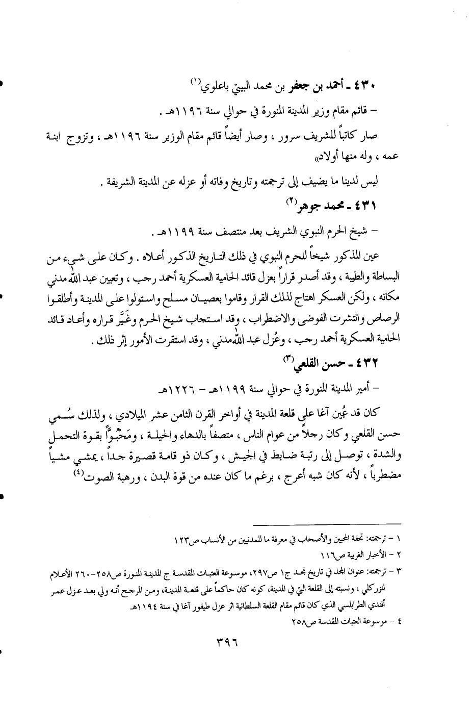 ترجمته: تحفة المحبين والأصحاب في معرفة ما للمدنيين من الأنساب ص123. 2 - الأخبار الغربية ص116. 3 - ترجمته: عنوان المجد في تاريخ نجد ج1 ص297، موسوعة العتبات المقدسة ج المدينة المنورة ص258 - 260 الأعلام للزركلي، ونسبته إلى القلعة التي في المدينة، كونه كان حاكماً على قلعة المدينة، ومن المرجح أنه ولي بعد عزل عمر أفندي الطرابلسي الذي كان قائم مقام القلعة السلطانية أثر عزل طيفور آغا في سنة 1194هـ 4 - موسوعة العتبات المقدسة ص258.