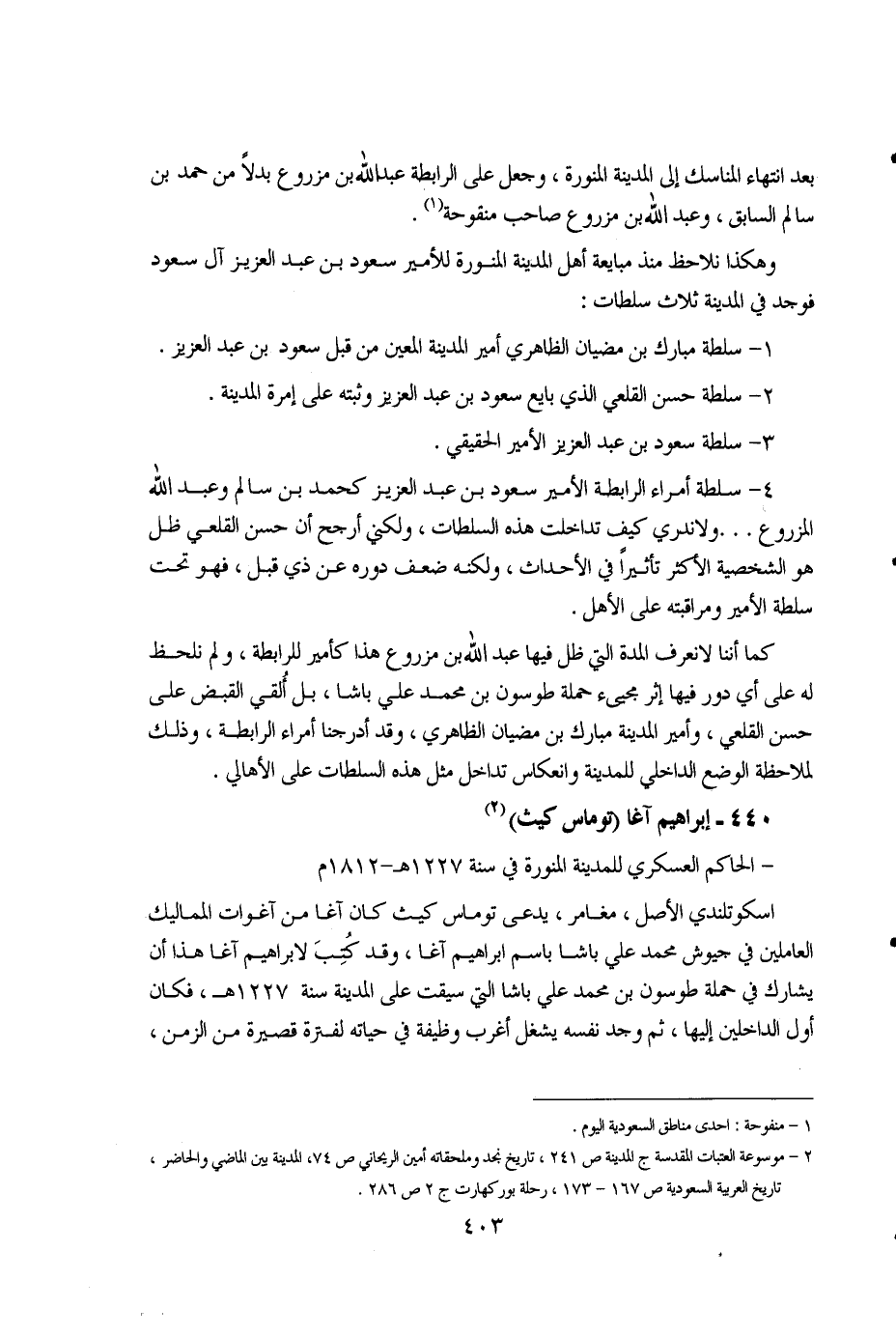 - الحاكم العسكري للمدينة المنورة في سنة 1227هـ- 1812م اسكوتلندي الأصل، مغامر، يدعى توماس كيث كان آغا من آغوات المماليك العاملين في جيوش محمد علي باشا باسم إبراهيم آغا، وقد كتب لإبراهيم آغا هذا أن يشارك في حملة طوسون بن محمد علي باشا التي سيقت على المدينة سنة 1227هـ، فكان أول الداخلين إليها، ثم وجد نفسه يشغل أغرب وظيفة في حياته لفترة قصيرة من الزمن، ...