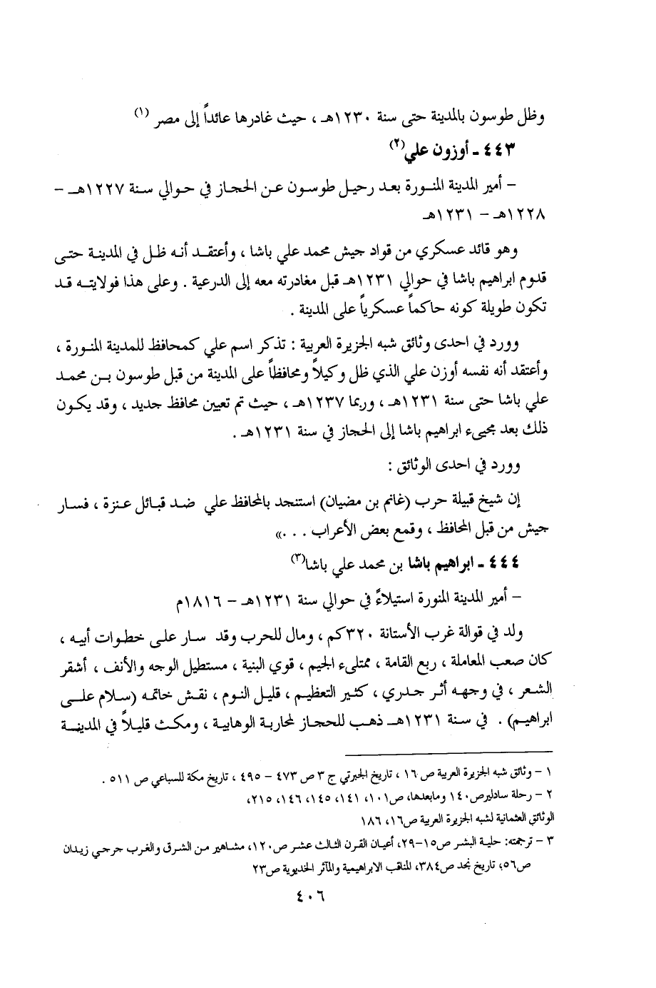 406 ... وظل طوسون بالمدينة حتى سنة 1230هـ، حيث غادرها عائداً إلى مصر (1)