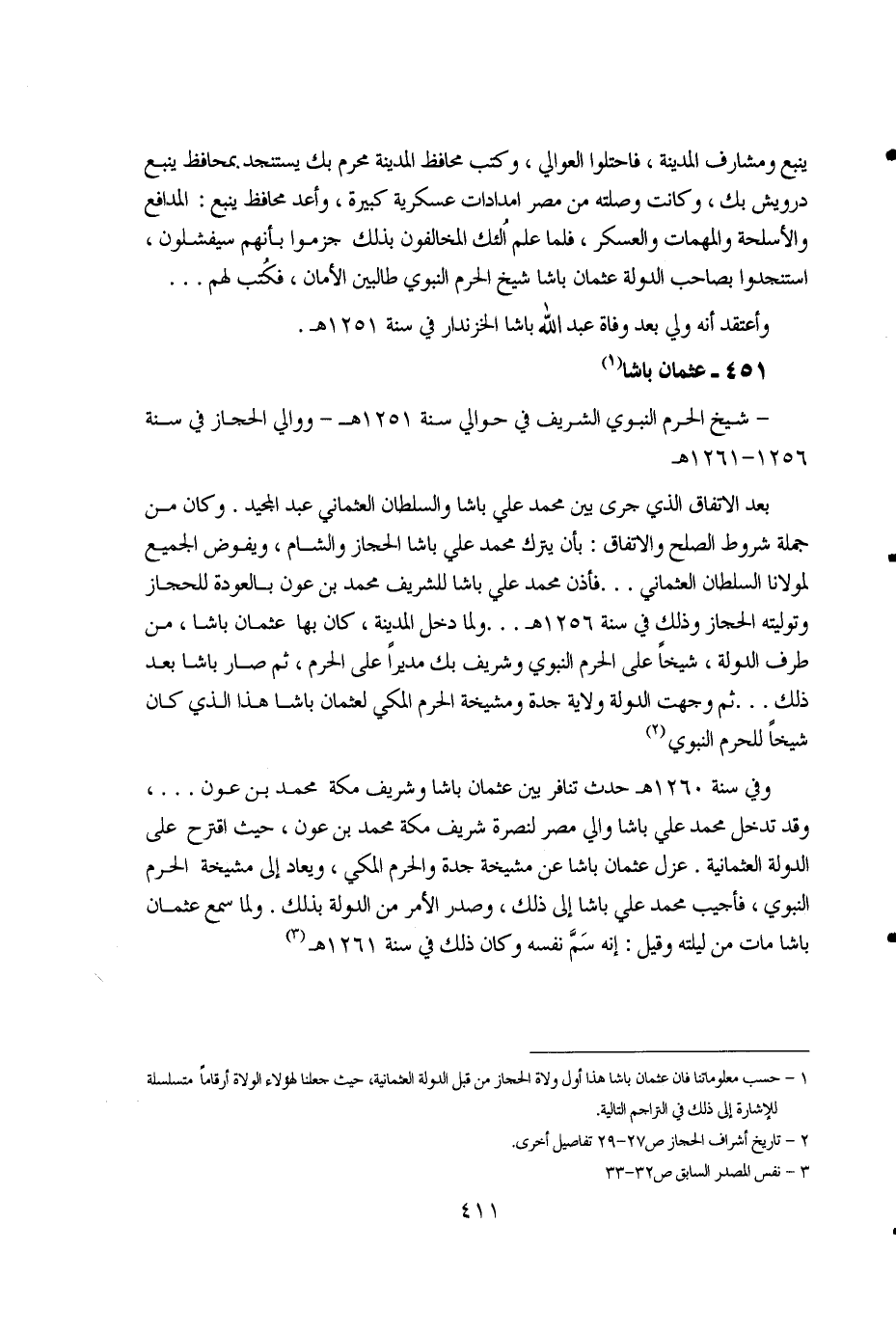 1 - حسب معلوماتنا فان عثمان باشا هذا أول ولاة الحجاز من قبل الدولة العثمانية، حيث جعلنا لهؤلاء الولاة أرقاماً متسلسلة للاشارة إلى ذلك في التراجم التالية. 2 - تاريخ أشراف الحجاز ص27 - 29 تفاصيل أخرى. 3 - نفس المصدر السابق ص32 - 33