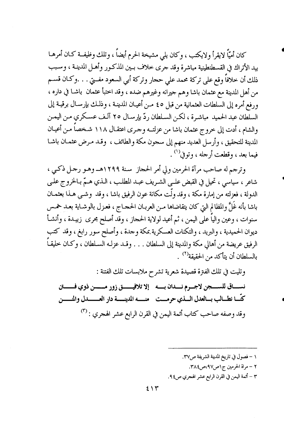 وترجم له صاحب مرآة الحرمين ولي أمر الحجاز سنة 1299هـ وهو رجل ذكي، شاعر، سياسي، تحيل في القبض على الشريف عبد المطلب، الذي همّ بالخروج على الدولة، فعزلته من إمارة مكة، وقد ولت مكانة عون الرفيق باشا، وقد وشى هذا بعثمان باشا بأنه غل والمظالم التي كان يتقاضاها من العربان الحجاج، فعزل بالوشاية بعد خمس سنوات، وعين والياً على اليمن، ثم أعيد لولاية الحجاز، وقد أصلح مجرى زبيدة، وأنشأ ديوان الحميدية، والبريد، والتكنات العسكرية بمكة وجدة، وأصلح سور رابغ، وقد كتب الرفيق عريضة من أهالي مكة والمدينة إلى السلطان .. وقد عزله السلطان، وكان خليقاً بالسلطان أن يتأكد من الحقيقة (2)