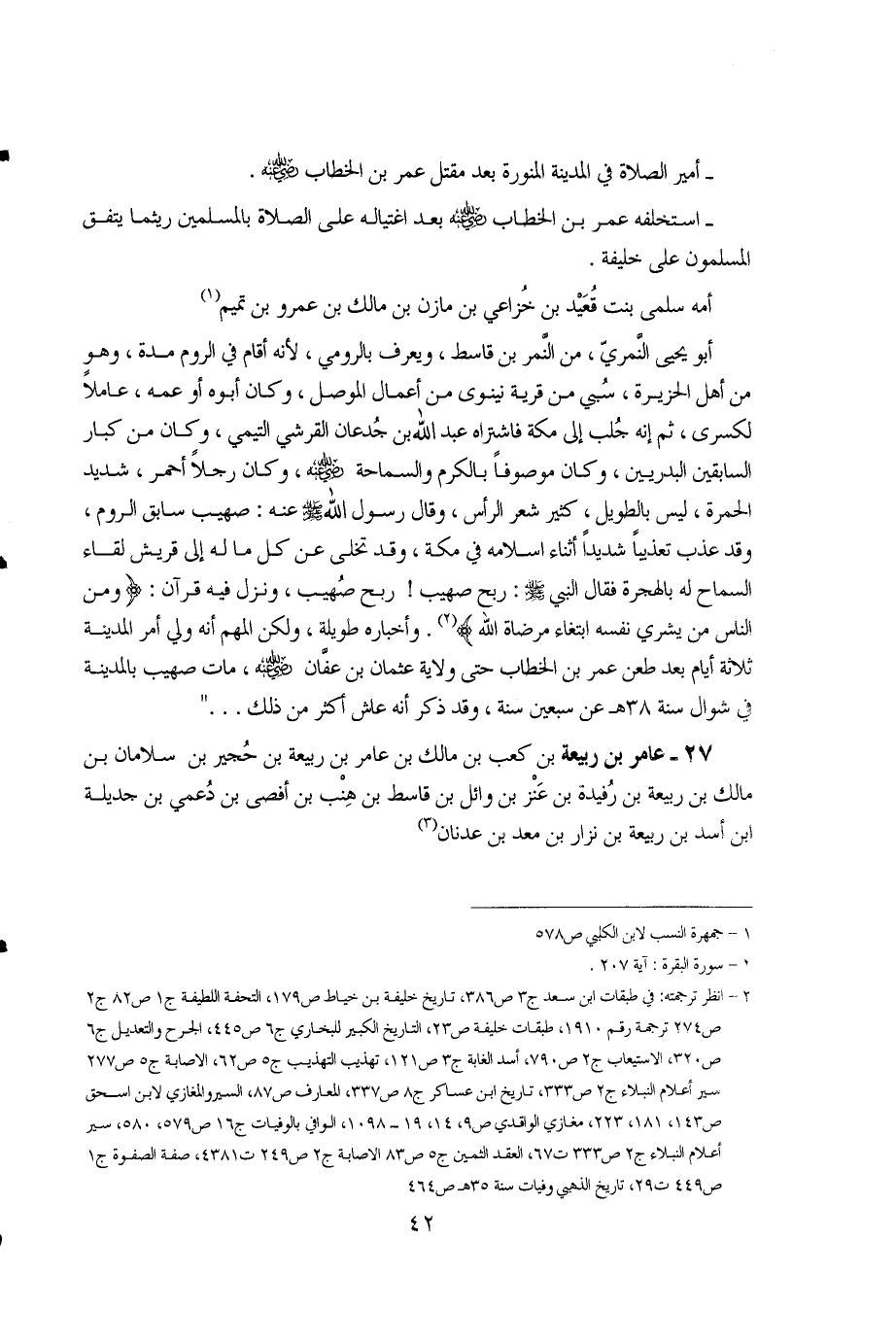 أمه سلمى بنت قُعَيْد بن خُزاعي بن مازن بن مالك بن عمرو بن تميم (1) أبو يحيى النَّمريّ، من النَّمر بن قاسط، ويعرف بالرومي، لأنه أقام في الروم مدة، وهو من أهل الجزيرة، سُبي من قرية نينوى من أعمال الموصل، وأن أبوه أو عمه، عاملاً لكسرى، ثم إنه جُلب إلى مكة فاشتراه عبد الله بن جُدعان القرشي التيمي، وكان من كبار السابقين البدريين، وكان موصوفاً بالكرم والسماحة رضي الله عنه، وكان رجلاً أحمر، شديد الحمرة، ليس بالطويل، كثير شعر الرأس، وقال رسول الله صلى الله عليه وسلم عنه: صهيب سابق الروم، وقد عذب تعذيباً شديداً أثناء إسلامه في مكة، وقد تخلى عن كل ماله إلى قريش لقاء السماح له بالهجرة فقال النبي صلى الله عليه وسلم: ربح صهيب! ربح صُهيب، ونزل فيه قرآن: (ومن الناس من يشري نفسه ابتغاء مرضاة الله) (2). وأخباره طويلة، ولكن المهم أنه ولي أمر المدية ثلاثة أيام بعد طعن عمر بن الخطاب حتى ولاية عثمان بن عفَّان رضي الله عنه، مات صهيب بالمدينة في شوال سنة 38هـ عن سبعين سنة، وقد ذكر أنه عاش أكثر من ذلك .. "