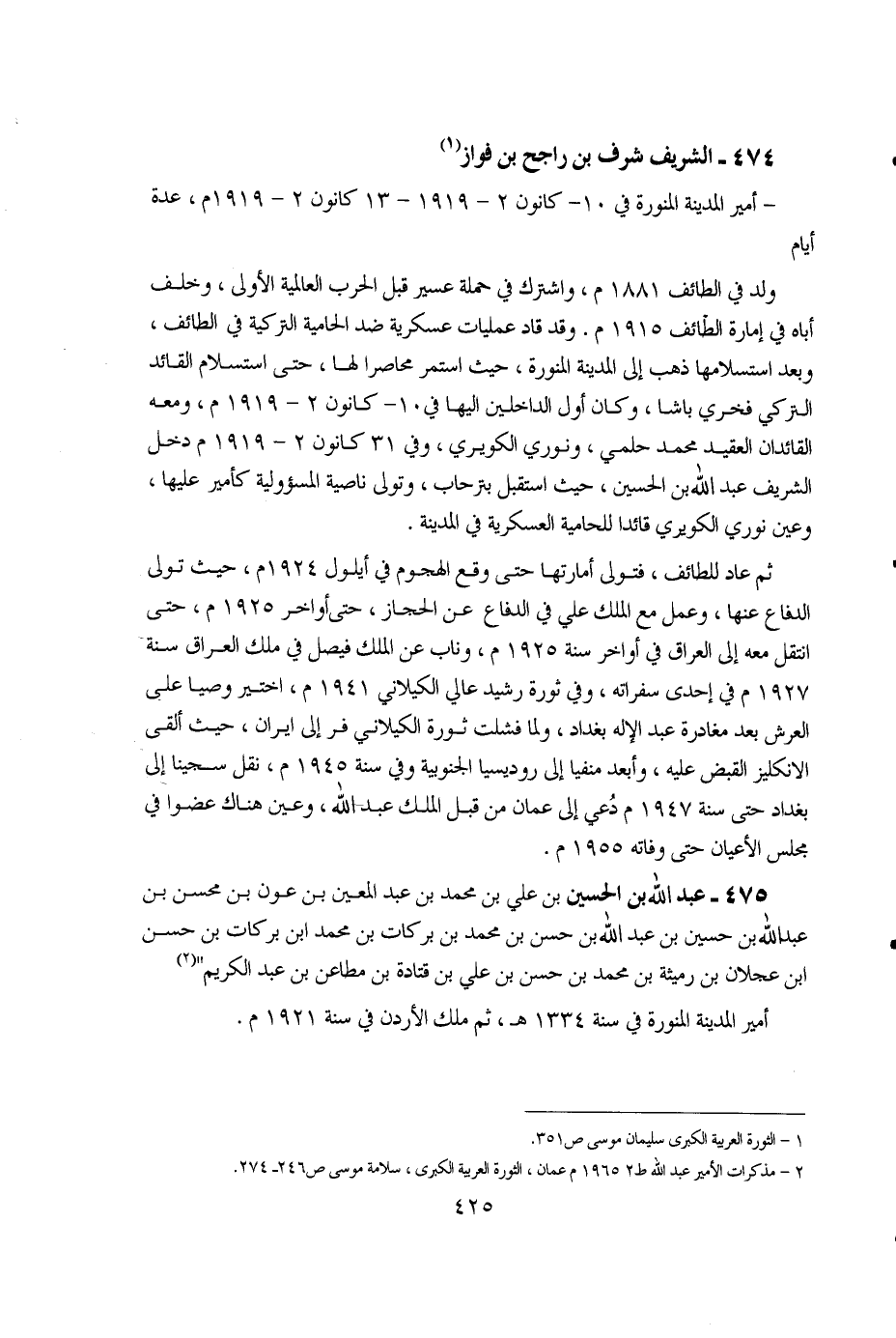 475 - عبد الله بن الحسين بن علي بن محمد بن عبد المعين بن عون بن محسن بن عبد الله بن حسين بن عبد الله بن حسن بن محمد بن بركات بن محمد ابن بركات بن حسن ابن عجلان بن رميثة بن محمد بن حسن بن علي بن قتادة بن مطاعن بن عبد الكريم (2) أمير المدينة المنورة في سنة 1334هـ، ثم ملك الأردن في سنة 1921م.