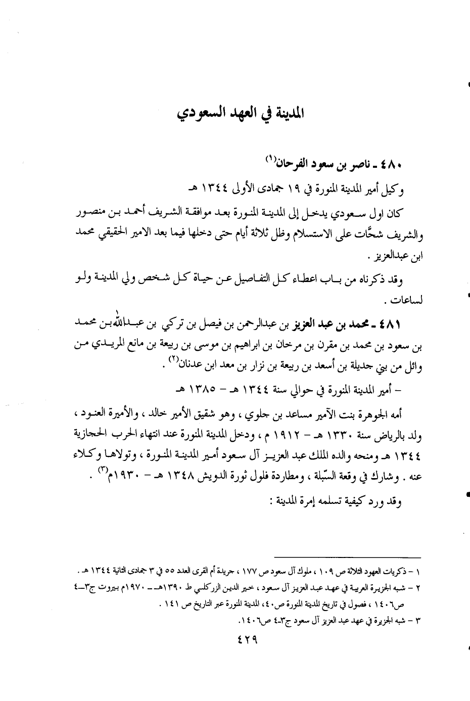 1 - ذكريات العهود الثلاثة ص109، ملوك آل سعود ص177، جريدة أم القرى العدد 55 في 3 جمادى الثانية 1344هـ. 2 - شبه الجزيرة العربية في عهد عبدالعزيز آل سعود، خير الدين الزركلي ط1390هـ- 1970م بيروت ج3 - 4 ص1406، فصول في تاريخ المدينة المنورة ص40، المدينة المنورة عبر التاريخ ص141. 3 - شبه الجزيرة في عهد عبدالعزيز آل سعود ج3 - 4 ص1406.