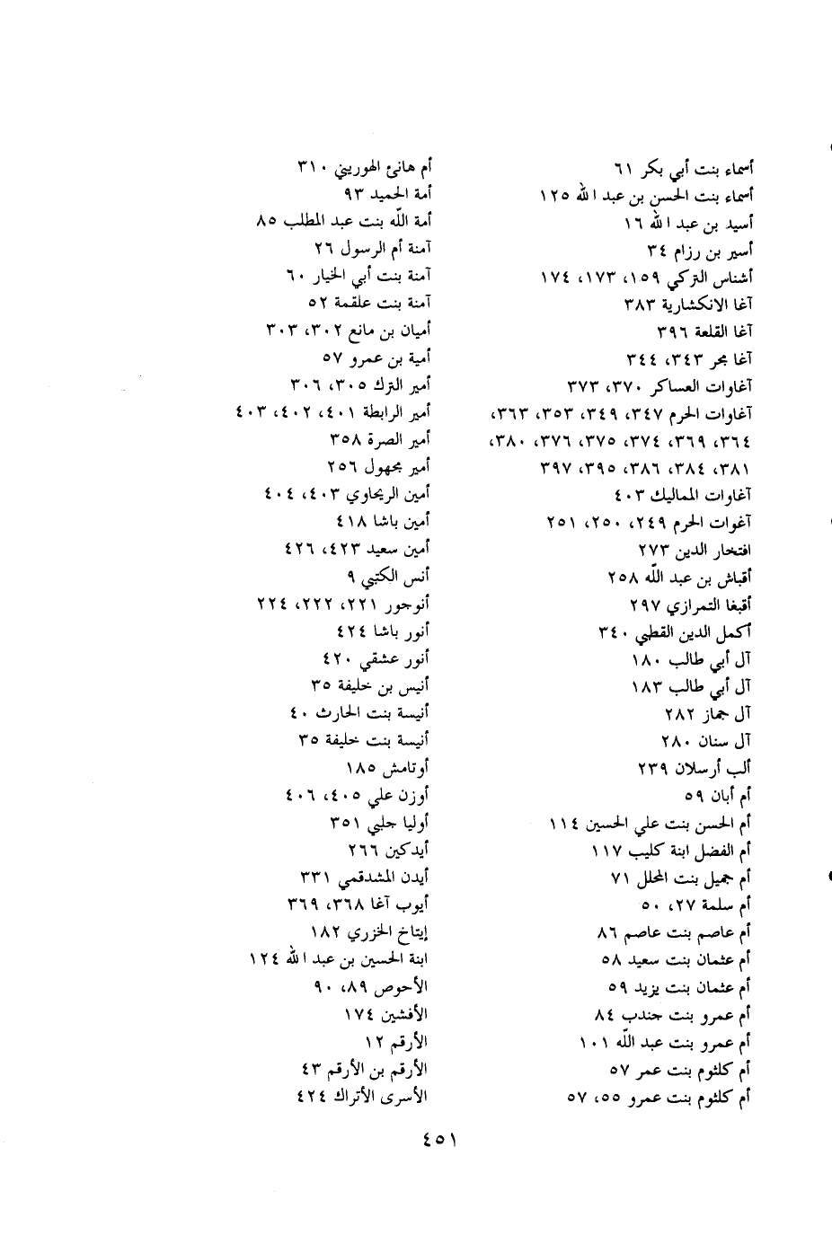 أسماء بنت أبي بكر 61 أم هانئ الهوريني310 أسماء بنت الحسن بن عبدالله 125 أمة الحميد93 أسيد بن عبدالله 16 أمة الله بنت عبدالمطلب 85 أسير بن رزام34 آمنة أم الرسلو 26 أشناس التركي 159،173،174 آمنة بنت أبي الخيار 60 آغا الانكشارية 383 آمنة بنت علقمة52 آغا القلعة 396 أميان بن مانع 302، 303 آغا مجر 343،344 أمية بن عمرو 57 آغاوات العساكر 370،373 أمير الترك 305،306 آغاوات الحرم 347،349، 353،363 أمير الرابطة 401،402،403،364،369،374،375،376،380 أمير الصرة 358،381،384،386،395،397 أمير مجهول 256 آغاوات المماليك 403 أمين الريحاوي 403،404 آغوات الحرم 249،250،251 أمين باشا 418 افتخار الدين 273 أمين سعيد 423،426 أقباش بن عبدالله 258 أنس الكتبي 9 أقبغا التمرازي 297 أنوجور 221،222،224 أكمل الدين القطبي340 أنور باشا 424 آل أبي طالب 180 أنور عشقي 420 آل أبي طالب 183 أنيس بن خليفة 35 آل جماز 282 أنيسة بنت الحارث 40 آل سنان280 أنيسة بنت خليفة35 ألب أرسلان 239 أوتامش 185 أم أبان 59 أوزن علي 405،406 أم الحسن بنت علي الحسين 114 أوليا جلبي 351 أم الفضل ابنة كليب 117 أيدكين 266 أم جميل بنت المحلل 71 أيدن المشدقمي 331 أم سلمة 27،50 أيوب آغا 368،369 أم عاصم بنت عاصم 86 إيتاخ الخزري 182 أم عثمان بنت سعيد 58 ابنة الحسين بن عبدالله 124 أم عثمان بنت يزيد 59 الأحوص 89،90 أم عمرو بنت جندب 84 الأفشين 174 أم عمرو بنت عبدالله 101 الأرقم 12 أم كلثوم بنت عمر 57 الأرقم بن الأرقم 43 أم كلثوم بنت عمرو 55،57 الأسرى الأتراك 424
