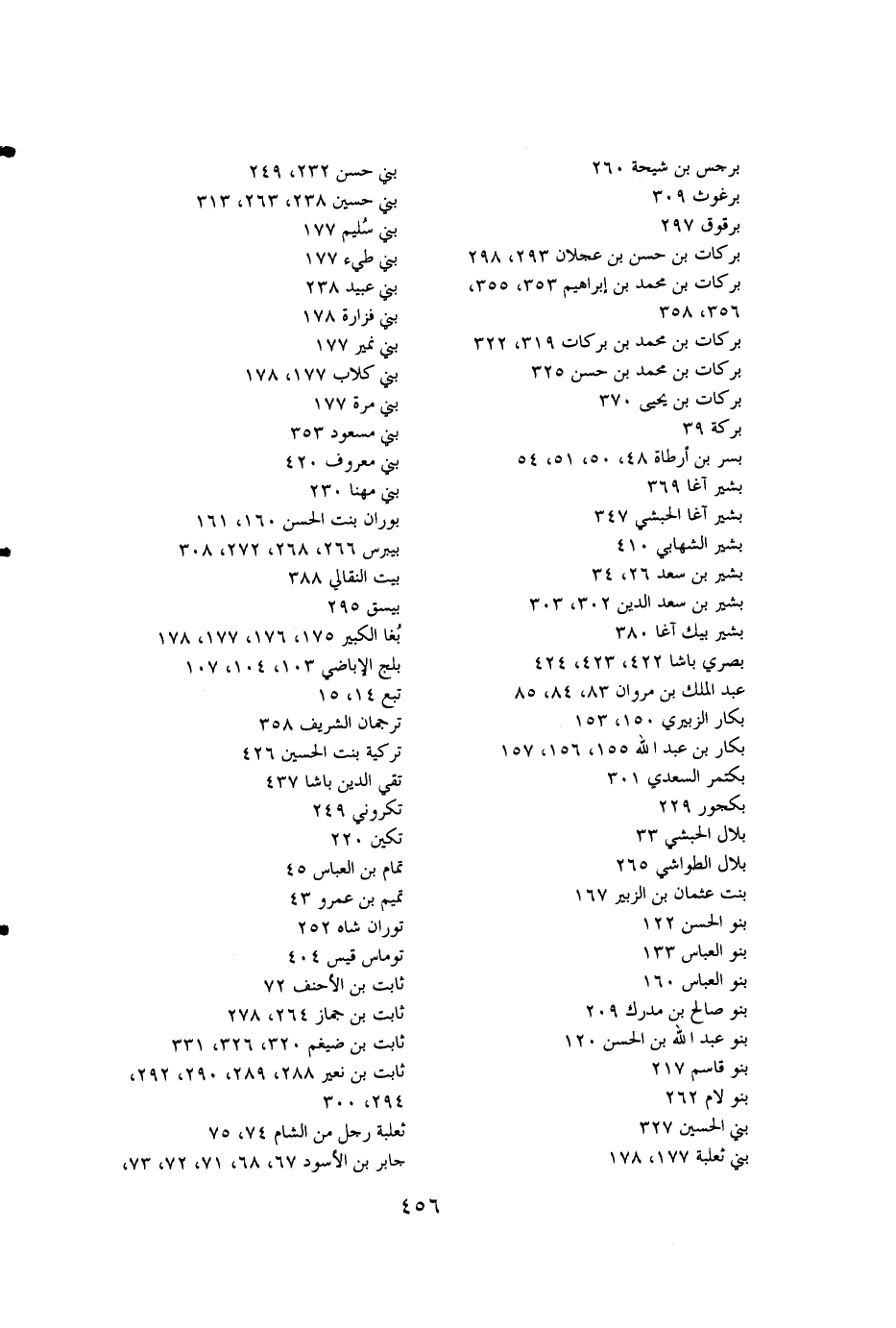 برجس بن شيحة 260 بني حسن 232، 249 برغوث 309 بني حسا5ين 238،263،313 برقوق 297 بني سليم 177 بركات بن حسن بن عجلان 293،298 بني طيء177 بركات بن محمد بن إبراهيم 353،355، بني عبيد238،256،358 بني فزارة 178 بركات بن محمد بن بركات 319،322 بني نمير177 بركات بن محمد بن حسن325 بني كلاب 177،178 بركات بن يحيى 370 بني مرة 177 بركة 39 بني مسعود353 بسر بن أرطاة 48،50،51،54 بني معروف 420 بشير آغا 369 بني مهنا 230 بشير آغا الحبشي 347 بوران بنت الحسن 160،161 بشير الشهابي 410 بيبرس 266،268،272،308 بشير بن سعد 26،34 بين النقالي 388 بشير بن سعد الدين 302،303 بيسق 295 بشير بيك آغا 380 بغا الكبير 175،176،177،178 بصري باشا 422،423،424 بلج الإباضي 103،104،107 عبدالملك بن مروان 83،84،85 تبع 14،15د بكار الزبيري 150،153 ترجمان الشريف 358 بكار بن عبدالله 155،156،157 تركية بنت الحسين 426 بكتمر السعدي 301 تقي الدين باشا 437 بكجور 229 تكروني 249 بلال الحبشي 33 تكين 220 بلال الطواشي 265 تمام بن العباس 45 بنت عثمان بن الزبير 167 تميم بن عمرو 43 بنو الحسن 122 توران شاه252 بنو العباس133 توماس قيس 404 بنو صالح بن مدرك 209 ثابت بن الأحنف 72 بنو عبدالله بن الحسن 120 ثابت بن ضيغم 320،326،331 بنو قاسم 217 ثابن بن نعير 288،289،290،292، بنو لام 262 294،300 بني الحسين 327 ثعلبة رجل من الشام 74،75 بني ثعلبة 177،178 جابر بن الأسود 67،68،71،72،73،