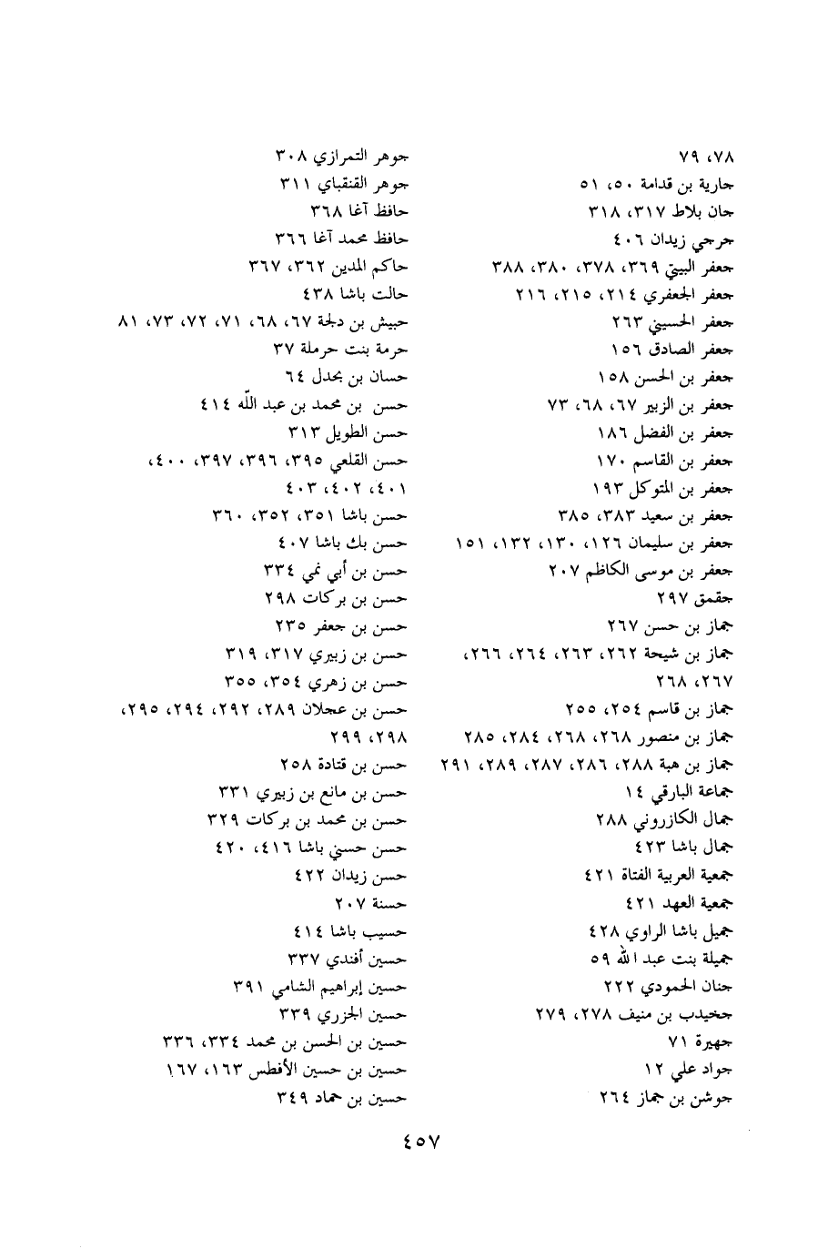 ،78،79 جوهر التمرازي 308 جارية بن قدامة 50،51 جوهر القنقباي 311 جان بلاط317،318 حافظ آغا 368 جرجي زيدان 406 حافظ محمد آغا 366 جعفر البيتي 369،378،380،388 حاكم المدين 362،367 جعفر الجعفري 214،215،216 حالت باشا 438 جعفر الحسيني 263 جيش بن دلجة 67،68،71،72،73،81 جعفر الصادق 156 حرمة بنت حرملة37 جعفر بن الحسن 158 حسان بن بحدل 64 جعفر بن الزبير 67،68،73 حسن بن محمد بن عبدالله414 جعفر بن الفضل 186 حسن الطويل 313 جعفر بن القاسم 170 حسن القلعي 395،396،397،400، جعفر بن المتوكل 193 401،402،403 جعفر بن سعيد 383،385 حسن باش 351،352،360 جعفر بن سليمان 126،130،132،151 حسن بك باشا 407 جعفر بن موسى الكاظم 207 حسن بن أبي نمي 334 جقمق 297 حسن بن بركات 298 جماز بن حسن 267 حسن بن جعفر 235 جماز بن شيحة 262،263،264،266، حسن بن زبيري 317،319،267،268 حسن بن زهري 354،355 جماز بن قاسم 254،255 حسن بن عجلان 289،292،294،295 جماز بن منصور 268،268،284،285 298،299 جماز بن هبة 288،286،287،289،291 حسن بن قتادة 258 جماعة البارقي 14 حسن بن مانع بن زبيري331 جمال الكازروني 288 حسن بن محمد بن بركات 329 جمال باشا 423 حسن حسني باشا 416،420 جمعية العربية الفتاة 421 حسن زيدان 422 جمعية العهد 421 حسنة 207 جميل باشا الراوي 428 حسيب باشا 414 جميلة بنت عبدالله 59 حسين أفندي 337 جنان الحمودي 222 حسين إبراهيم الشامي 391 جخيدب بن منيف 278،279 حسين الجزري 339 جهيرة 71 حسين بن الحسن بن محمد 334،336 جواد علي 12 حسين بن حسين الأفطس 163،167 جوشن بن جماز 264 حسين بن حماد 349