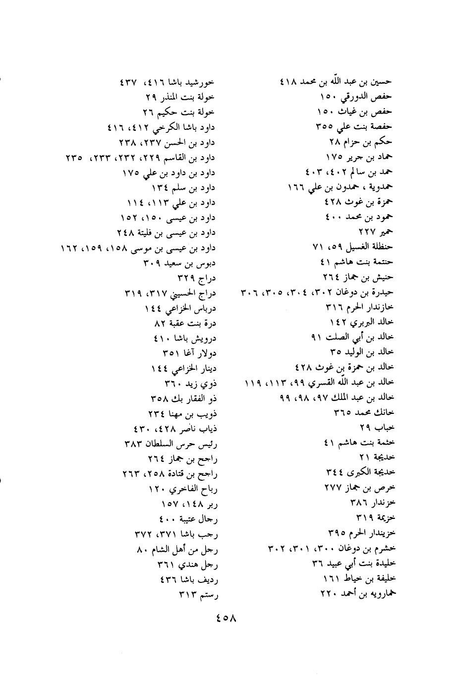 حسين بن عبدالله بن محمد 418 خورشيد باشا 416،437 حفص الدورقي 150 خولة بنت المنذر 29 حفص بن غياث 150 خولة بنت حكيم 26 حفصة بنت علي 355 داود باشا الكرخي 412،416 حكم بن حزام 28 داود بن الحسن 237،238 حماد بن جرير 175 داود بن القاسم 229،232،233،235 حمد بن سالم 402،403 داود بن داود بن علي 175 حمدوية، حمدون بن علي 166 داود بن سليم 134 حمزة بن غوث 428 داود بن علي 113،114 حمود بن محمد 400 داود بن عيسى 150،152 حمير 227 داود بن عيسى بن فليتة 248 حنظلة الغسيل 59،71 داود بن عيسى بن موسى 158،159،162 حنتمة بنت هاشم 41 دبوس بن سعيد 309 حنيش بن جماز 264 دراج 329 حيدرة بن دوغان 302،304،305،306 دراج الحسيني 317،319 خازندار الحرم 316 درباس الخزاعي 144 خالد البربري 142 درة بنت عقبة 82 خالد بن أبي الصلت 91 درويش باشا 410 خالد بن الوليد 35 دولار آغا 351 خالد بن حمزة بن غوث 428 دينار الخزاعي 144 خالد بن عبدالله القسري 99،113،119 ذوي زيد 360 خالد بن عبدالملك 97،98،99 ذو الفقار بك 358 خانك محمد 365 ذويب بن مهنا 234 خباب 29 ذياب ناصر 428،430 خثمة بنت هاشم 41 رئيس حرس السلطان 383 خديجة 21 راجح بن جماز 264 خديجة الكبرى 344 راجح بن قتادة 258،263 خرص بن جماز 277 رباح الفاخري 120 خزندار 386 ربر 148،157 خزيمة 319 رجال عتيبة 400 خزيندار الحرم 395 رجب باشا 371،372 خشرم بن دوغان 300،301،302 رجل من أهل الشام 80 خليدة بنت أبي عبيد 36 رجل هندي 361 خليفة بن خياط 161 رديف باشا 436 خمارويه بن أحمد 220 رستم 313