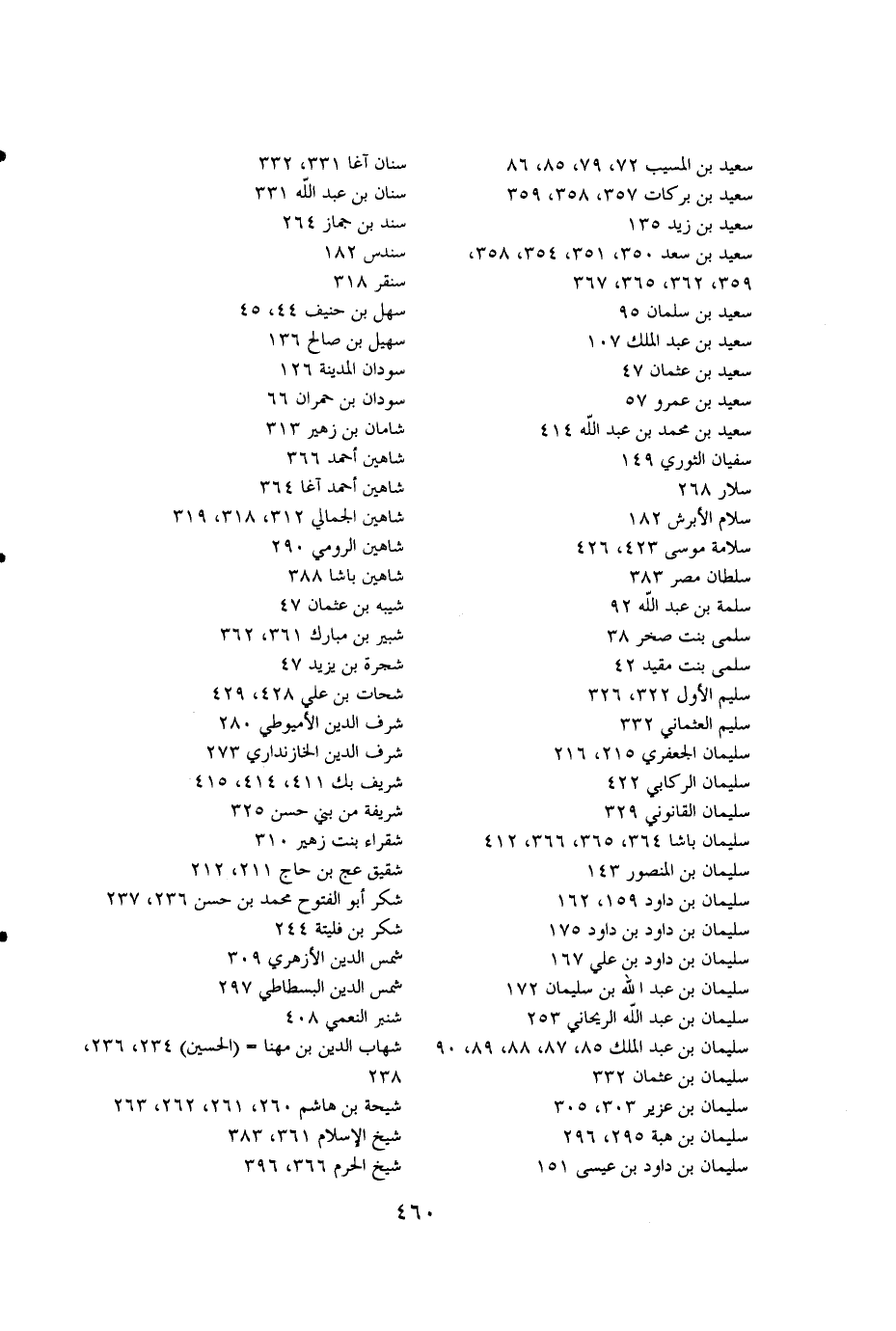 سعيد بن المسيب 72،79،85،86 سنان آغا 331،332 سعيد بن بركات 357،358،359 سنان بن عبدالله 331 سعيد بن زيد 135 سند بن جماز 264 سعيد بن سعد 350،351،354،358، سندس 182،359،362،365،367 سنقر 318 سعيد بن سلمان 95 سهل بن حنيف 44،45 سعيد بن عبدالملك 107 سهيل بن صالح 136 سعيد بن عثمان 47 سودان المدينة 126 سعيد بن عمرو 57 سودان بن حمران 66 سعيد بن محمد بن عبدالله 414 شامان بن زهير 313 سفيان الثوري 149 شاهين أحمد 366 سلار 268 شاهين أحمد آغا 364 سلام الأبرش 182 شاهين الجمالي 312،318،319 سلامة موسى 423،426 شاهين الرومي 290 سلطان مصر 383 شاهين باشا 388 سلمة بن عبدالله 92 شيبه بن عثمان 47 سلمى بنت صخر 38 شبير بن مبارك 361،362 سلمى بنت مقيد 42 شجرة بن يزيد 47 سليم الأول 322، 326 شحات بن علي 428، 429 سليم العثماني 332 شرف الدين الأميوطي 280 سليمان الجعفري 215، 216 شرف الدين الخازنداري 273 سليمان الركابي 422 شريف بك 411،414،415 سليمان القانوني 329 شريفة من بني حسن 325 سليمان باشا 364،365،366،412 شقراء بنت زهير 310 سليمان بن المنصور 143 شقيق عج بن حاج 211،212 سليمان بن داود 159،162 شكر أبو الفتوح محمد بن حسن 236،237 سليمان بن داود بن داود 175 شكر بن فليتة 244 سليمان بن داود بن علي 167 شمس الدين الأزهري 309 سليمان بن عبدالله بن سليمان 172 شمس الدين البسطاطي 297 سليمان بن عبدالله الريحاني 253 شنبر النعمي 408 سليمان بن عدالملك 85،87،88،89،90 شهاب الدين بن مهنا= (الحسين) 234،236 سليمان بن عثمان 332 238 سليمان بن عزيز 303،305 شيحة بن هاشم 260،261،262،263 سليمان بن هبة 295،296 شيخ الإسلام 361،383 سليمان بن داود بن عيسى151 شيخ الحرم 366،396