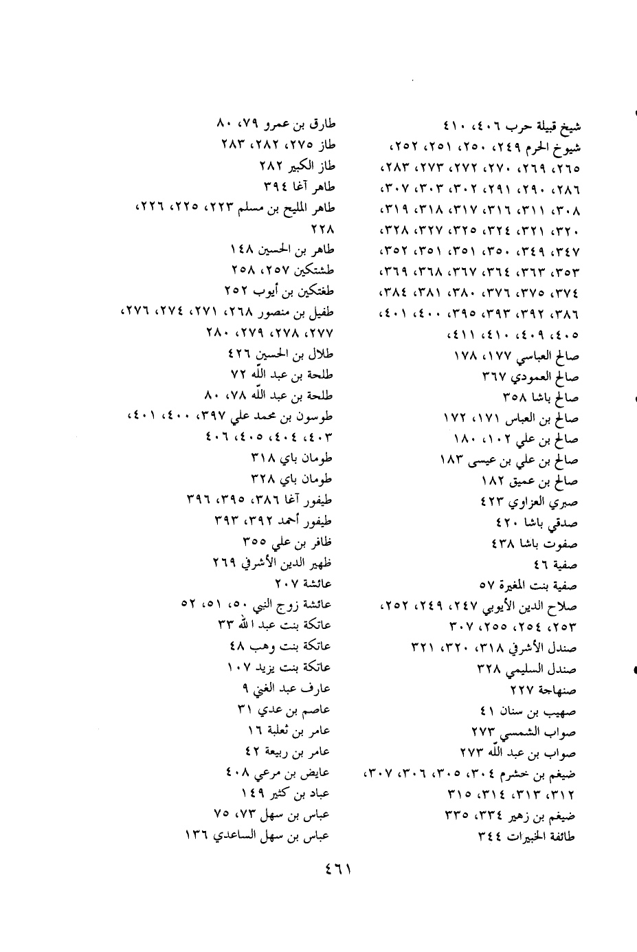 شيخ القبيلة حرب 406،410 طارق بن عمرو 79،80 شيوخ الحرم 249،250،251،252، طاز 275،282،283،265،269،270،272،273،283، طاز الكبير 282،286،290،291،302،303،307، طاهر آغا 394،308،311،316،317،318،319، طاهر المليح بن مسلم 223،225،226،،320،321،324،325،327،328، 228،347،349،350،351،351،352، طاهر بن الحسين 148،353،363،364،367،368،369، طشتكين 257،258،374،375،376،380،381،384، طغتكين بن أيوب 252،386،392،393،395،400،401، طفيل بن منصور 268،271،274،276،،405،409،410،411، 277،278،279،280 صالح العباسي 177،178 طلال بن الحسين 426 صالح العمودي 367 طلحة بن عبدالله 72 صالح باشا 358 طلحة بن عبدالله 78،80 صالح بن العباس 171،172 طوسون بن محمد علي 397، 400،401 صالح بن علي 102،108 403،404،405،406 صالح بن علي بن عيسى 183 طومان باي 318 صالح بن عميق 182 طومان باي 328 صبري العزاوي 423 طيفور آغا 386،395،396 صدقي باشا 420 طيفور أحمد 392،393 صفوت باشا 438 ظافر بن علي 355 صفية 46 ظهير الدين الأشرفي 269 صفية بنت المغيرة 57 عائشة 207 صلاح الدين الأيوبي 247،249،252، عائشة زوج النبي 50،51،52،253،254،255،307 عاتكة بنت عبدالله 33 صندل الأشرفي 318،320،321 عاتكة بنت وهب 48 صندل السليمي 328 عاتكة بنت يزيد 107 صنهاجة 227 عارف عبد الغني 9 صهيب بن سنان 41 عاصم بن عدي 31 صواب الشمس 273 عامر بن ثعلبة 16 صواب بن عبدالله 273 عامر بن ربيعة 42 ضيغم بن خشرم 304،305،306،307 عايض بن مرعي 408،312،313،314،315 عباد بن كثير 149 ضيغم بن زهير 334،335 عباس بن سهل 73،75 طائفة الخبيرات 344 عباس بن سهل الساعدي 136
