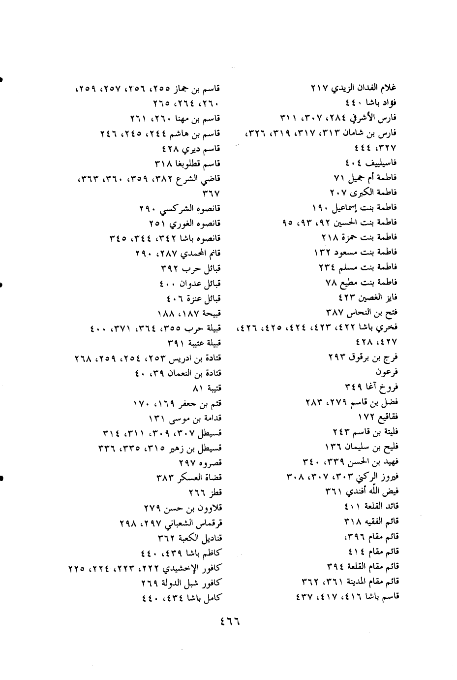 غلام الفدان الزيدي 217 قاسم بن جماز 255،256،257،259، فؤاد باشا 440 260،264،265 فارس الأشرفي 284،307،311 قاسم بن مهنا 260،261 فارس بن شامان 313،317،319،326 قاسم بن هاشم 244،245،246،327،444 قاسم ديري 428 فاسيلييف 404 قاسم قطلوبغا 318 فاطمة أم جميل 71 قاضي الشرع 382،359،360،363، فاطمة الكبرى 207 367 فاطمة بنت اسماعيل 190 قانصوه الشركسي 290 فاطمة بنت الحسين 92،93،95 قانصوه الغوري 251 فاطمة بنت حمزة 218 قانصوه باشا 342،344،345 فاطمة بنت مسعود 132 قانم المحمدي 287،290 فاطمة بنت مسلم 234 قبائل حرب 392 فاطمة بنت مطيع 78 قبائل عدوان 400 فايز الغصين 423 قبائل عنزة 406 فتح بن النحاس 387 قبيحة 187،188 فخري باشا 422،423،424،425،426، قبيلة حرب 355،364،371،400،427،428 قبيلة عتيبة 391 فرج بن برقوق 293 قتادة بن ادريس 253،254،259،268 فرعون قتادة بن النعما 39،40 فروخ آغا 349 قتيبة 81 فضل بن قاسم 279،283 قثم بن جعفر 169،170 فقاقيع 172 قدامة بن موسى 131 فليتة بن قاسم 243 قسيطل 307،309،311،314 فليح بن سليمان 136 قسيطل بن زهير 315،335،336 فهيد بن الحسن 339،340 قصروه 297 فيروز الركني 303،307،308 قضاة العسكر 383 فيض الله أفندي 361 قطز 266 قائد القلعة 401 قلاوون بن حسن 279 قائم الفقيه 318 قرقماس الشعباني 297،298 قائم مقام 396، قناديل الكعبة 362 قائم مقام 414 كاظم باشا 439، 440 قائم مقام القلعة394 كافور الإخشيدي 222،223،224،225 قائم مقام المدينة 361،362 كافور شبل الدولة 269 قاسم باشا 416،417،437 كامل باشا 434،440