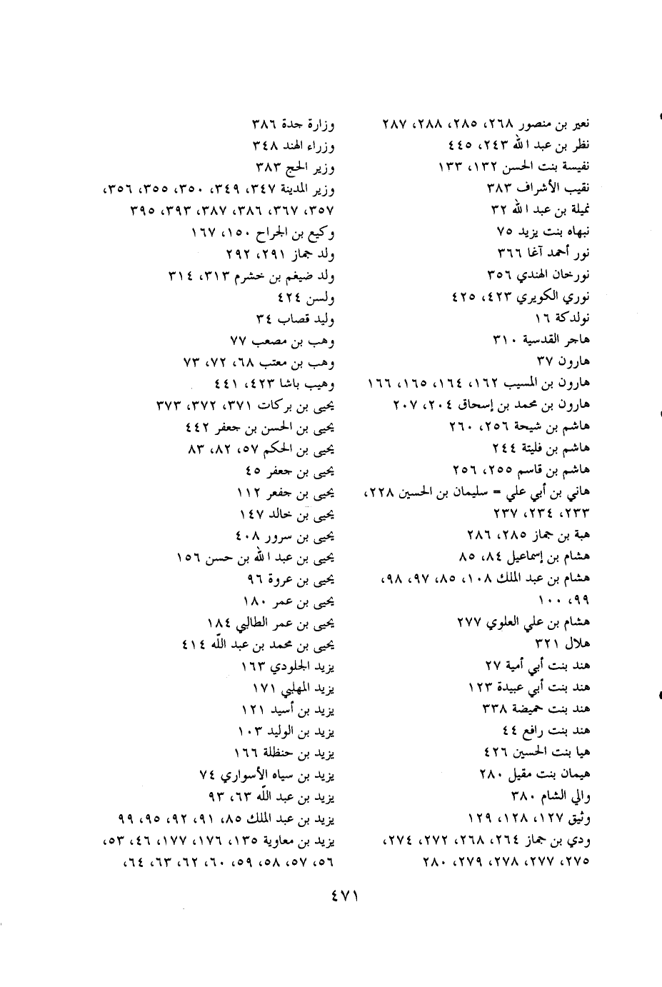نعير بن منصور 268،285،288،287 وزارة جدة 386 نظر بن عبدالله 243،445 وزراء الهند 348 نفيسة بنت الحسن 132،133 وزير الحج 383 نقيب الأشراف 383 وزير المدينة 347،349،350،355،356، نميلة بن عبد الله 32 357،367،386،387،393،395 نبهاه بنت يزيد 75 وكيع بن الجراح 150،167 نور أحمد آغا 366 ولد جماز 291،292 نورخان الهندي 356 ولد ضيغم بن خشرم 313، 314 نوري الكويري423،425 ولسن 424 نولدكه 16 وليد قصاب 34 هاجر القدسية310 وهب بن مصعب 77 هارون 37 وهب بن متعب 68،72،73 هارون بن المسيب 162،164،165،166 وهيب باشا 423،441 هارون بن محمد بن إسحاق 204،207 يحيى بن بركات 371،372،373 هاشم بن شيحة 256،260 يحيى بن الحسن بن جعفر 442 هاشم بن فليته 244 يحيى بن الحكم 57،82،83 هاشم بن قاسم 255،256 يحيى بن جعفر 45 هاني بن أبي علي= سليمان بن الحسين228، يحيى بن جعفر 112،233،234،237 يحيى بن خالد 147 هبة بن جماز285،286 يحيى بن سرور 408 هشام بن إسماعيل 84،85 يحيى بن عبدالله بن حسن 156 هشام بن عبد الملك 108،85،97،98، يحيى بن عروة 96،99،100 يحيى بن عمر 180 هشام بن علي العلوي 277 يحيى بن عمر الطالبي 184 هلال 321 يحيى بن محمد بن عبدالله 414 هند بنت أبي أمية 27 يزيد الجلودي 163 هند بنت أبي عبيدة 123 يزيد المهلبي 171 هند بنت حميضة 338 يزيد بن أسيد 121 هند بنت رافع 44 يزيد بن الوليد 103 هيا بنت الحسين 426 يزيد بن حنظلة 166 هيمان بنت مقيل 280 يزيد بن سياه الأسواري 74 والي الشام 380 يزيد بن عبدالله 63،93 وثيق 127،128،129 يزيد بن عبدالملك 85،91،92،95،99 ودي بن جماز 264،268،272،274 يزيد بن معاوية 135،176،177،46،53،،275،277،278،279،280 56،57،58،59،60،62،63،64،