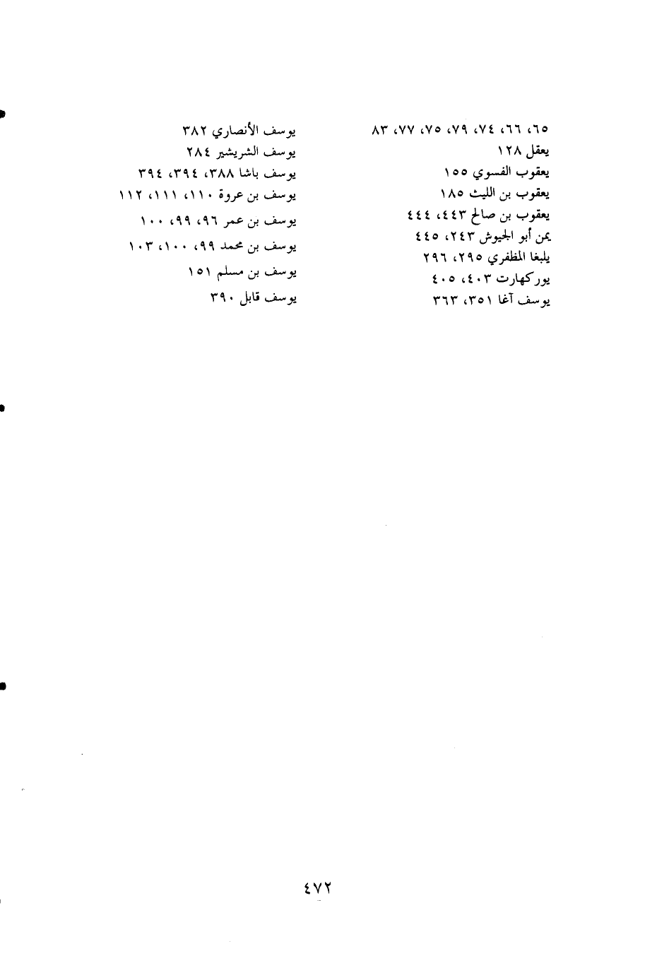 ،65،66،74،79،75،77،83 يوسف الأنصاري 382 يعقل 128 يوسف الشريشير 284 يعقوب الفسوي 155 يوسف باشا 388،394،394 يعقوب بن الليث 185 يوسف بن عروة 110،111،112 يعقوب بن صالح 443،444 يوسف بن عمر 96،99،100 يمن أبو الجيوش 243،445 يوسف بن محمد 99،100،103 يلبغا المظفري 295،296 يوسف بن مسلم 151 يوركهارت 403،405 يوسف قابل 390 يوسف آغا 351،363