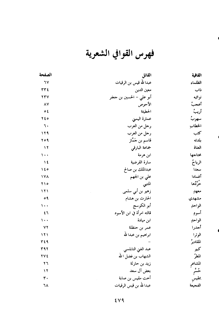 القافية القائل الصفحة الظلماء عبدالله قيس بن الرقيات 67 ذاب معين الدين 334 نوائبه أبوعلي -الحسين بن جعفر 237 أعجب الأحوص 87 أريب الحطيئة 54 سهوب عمارة اليمني 245 الخطاب رجل من العرب 60 كثب رجل من العرب 129 بلدته قاسم بن جماز 259 العتاة جماعة البارقي 12 محتاجها ابن هرمة 100 الرياح سارة القرضية 14 سعدا عبدالملك بن صالح 145 أغمادا علي بن الجهم 178 خردها المتنبي 215 معهد زهير بن أبي سلمى 121 مشهدي الحارث بن هشام 59 الواحد أبو الكرسج 100 أسود قالته امرأة في ابن الأسود 46 الواحد ابن ميادة 100 أجدرا عمر بن حنظلة 72 الوترا ابراهيم بن عبدالله 121 المقادير - 349 كبير عبدالغني النابلسي 392 المطر الشهاب بن فضل الله 274 المشاعر زيد بن حارثة 26 حُسر بعض آل سعد 12 بمقيس أخت مقيس بن صابة 30 الفجيعة عبدالله بن قيس الرقيات 68