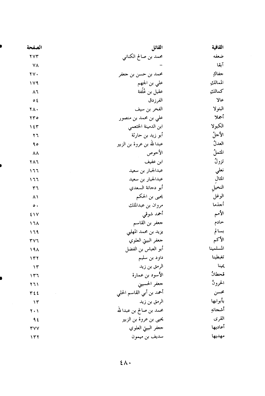 القافية القائل الصفحة ضعفه محمد بن صالح الكناني 273 آبقا - 78 جفاك محمد بن حسن بن جعفر 270 الممالك علي بن الجهم 179 كمالك عقيل بن علفة 86 عالا الفرزدق 54 البتولا الفخر بن سيف 280 أجملا علي بن محمد بن منصور 235 الكبولا ابن الدمينة الخثعمي 143 الأجل أبو زيد بن حارثة 26 العدل عبدالله بن عروة بن الزبير 95 المثمل الأحوص 88 تزول ابن عفيف 286 نعلي عبدالجبار بن سعيد 166 المثال عبد الجبار بن سعيد 166 النخيل أبو دجانة السعدي 36 الوغل يحيى بن الحكم 81 أجذما مروان بن عبدالملك 50 الأمم أحمد شوقي 417 خادم جعفر بن القاسم 168 بسالم يزيد بن محمد المهلبي 168 الأكم جعفر البيتي العلوي 376 المسلمينا أبو العباس بن الفضل 198 تغبطينا داود بن سليم 132 يمينا الرمق بن زيد 13 قحطان الأسود بن عمارة 136 الحرون جعفر الحسيني 261 محسن أحمد بن أبي القاسم الحلبي 344 بأبوابها الرمق بن زيد 13 أشجانه محمد بن صالح بن عبدالله 201 القرى يحيى بن عروة بن الزبير 94 أعاديها جعفر البيتي العلوي 377 مهديها سديف بن ميمون 132