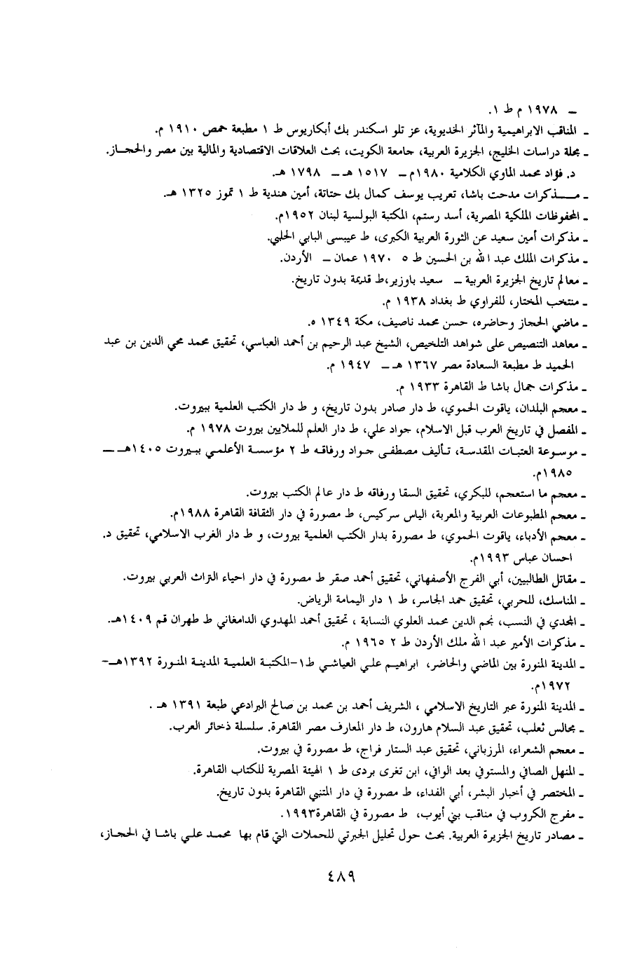 - المناقب الابراهيمية والمآثر الخديوية، عز تلو اسكندر بك أبكاريوس ط1 مطبعة حمص 1910م. - مجلة دراسات الخليج، الجزيرة العربية، جامعة الكويت، بحث العلاقات الاقتصادية والمالية بين مصر والحجاز، د. فؤاد محمد الماوي الكلامية 1980م- 1517هـ - 1798هـ. -مذكرات مدحت باشا، تعريب يوسف كمال بك حتاتة، أمين هندية ط1 تموز 1325هـ. - المحفوظات الملكية المصرية، أسد رستم، المكتبة البولسية لبنان 1952م. - مذكرات الملك عبدالله بن الحسن ط5 1970 عمان- الأردن. - معالم تاريخ الجزيرة العربية- سعيد باوزير، ط قديمة بدون تاريخ. -منتخب المختار، للفراوي ط بغداد 1938م. - ماضي الحجاز وحاضره، حسن محمد ناصيف، مكة 1349هـ. - معاهد التنصيص على شواهد التلخيص، الشيخ عبدالرحيم بن أحمد العباسي، تحقيق محمد محي الدين بن عبد الحميد ط مطبعة السعادة مصر 1367هـ - 1947م. - مذكرات جمال باشا ط القاهرة 1933م. - معجم البلدان، ياقوت الحموي، ط دار صادر بدون تاريخ، و ط دار الكتب العلمية ببيروت. - المفصل في تاريخ العرب قبل الاسلام، جواد علي، ط دار العلم للملايين بيروت 1978م. - موسوعة العتبات المقدسة، تأليف مصطفى جواد ورفاقه ط2 مؤسسة الأعلمي ببيروت 1405هـ - 1985م. - معجم ما استعجم، للبكري، تحقيق السقا ورفاقه ط دار عالم الكتب بيروت. - معجم المطبوعات العربية والمعربة، الياس سركيس، ط مصورة في دار الثقافة القاهرة 1988م. - معجم الآدباء، ياقوت الحموي، ط مصورة بدار الكتب العلمية بيروت، و ط دار الغرب الإسلامي، تحقيق د. احسان عباس 1993م. - مقاتل الطالبيين، أبي الفرج الأصفهاني، تحقيق أحمد صقر ط مصورة في دار احياء التراث العربي بيروت. - المناسك، للحربي، تحقيق حمد الجاسر، ط 1 دار اليمامة الرياض. - المجدي في النسب، نجم الدين محمد العلوي النسابة، تحقيق أحمد المهدوي الدامغاني ط طهران قم 1409هـ.