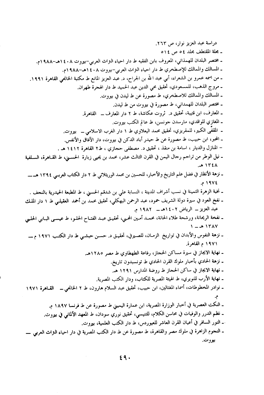 - مجلة المقتطف مجلد 54 ص514 - مختصر البلدان للهمذاني، المعروف بابن الفقيه ط دار احياء التراث العربي- بيروت 1408هـ- 1988م. - المسالك والممالك للإصطخري ط دار احياء التراث العربي- بيروت 1408هـ- 1988م. - من اسمه عمرو بن الشعراء، أبي عبدالله بن الجراح، د. عبد العزيز المانع ط مكتبة الخانجي القاهرة 1991. -مروج الذهب، للمسعودي، تحقيق محي الدين عبد الحميد ط دار الهجرة طهران. - المسالك والممالك للاصطخري، ط مصورة عن ط ليدن في بيروت. - مختصر البلدان للهمداني، ط مصورة في بيروت من ط ليدن. -المعارف، ابن قتيبة، تحقيق د. ثروت عكاشة، ط2 دار المعارف - القاهرة. - المغازي للواقدي، مارسدن جونسن، ط عالم الكتب بيروت. - المقفى الكبير، للمقريزي، تحقيق محمد اليعلاوي ط1 دار الغرب الاسلامي- بيروت - المحبر - المنازل والديار، اسامة بن منقذ، تحقيق د. مصطفى حجازي، ط2 القاهرة 1412هـ - نيل الوطر من تراجم رجال اليمن في القرن الثالث عشر، محمد بن يحيى زبارة الحسني، ط القاهرة، السلفية 1348هـ. - نزهة الأنظار في فضل علم التاريخ والأخبار، للحسين بن محمد الوريثلاتي ط 2 دار الكتاب العربي 1394هـ - 1974م. - نخبة الزهرة الثمينة في نسب أشراف المدينة، النسابة علب بن شدقم الحسني، ط المطبعة الحيدرية بالنجف. - نفخ العود في سيرة دولة الشريف حمود، عبد الرحمن البهكلي، تحقيق محمد بن أحمد العقيلي ط1 دار الملك عبد العزيز - الرياض 1402هـ - 1982م. - نفخة الريحانة، ورشحة طلاء الحانة، محمد أمين المحبي، تحقيق عبد الفتاح الحلو، ط عيسى البابي الحلبي 1387هـ - 1 - نزهة النفوس والأبدان في تواريخ الزمان، للصيرفي، تحقيق د. مصطفى حجازي، ط2 القاهرة 1412هـ. - نيل الوطر من تراجم رجال اليمن في القرن الثالث عشر، محمد بن يحيى زبارة الحسني، ط القاهرة، السلفية 1348هـ.