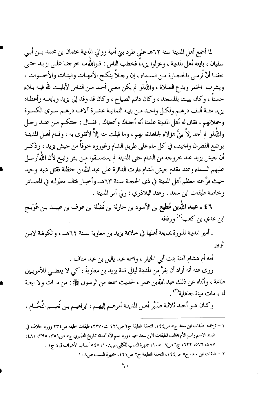 1 - ترجمته: طبقات ابن سع ج5 ص144، التحفة اللطيفة ج2 ص421 ت2270، طبقات خليفة ص234 وورد خلاف في ضبط الاسم واسم الأم يخالف الطبقات لابن سعد حيث ورد اسم الأم آمنة، تاريخ الطبري ج5 ص351، 395، 481، 487، 576، 622، ج6 ص7 - 105، جمهرة النسب للكلبي ص108، 547 أنساب الأشراف ق4 ج1.