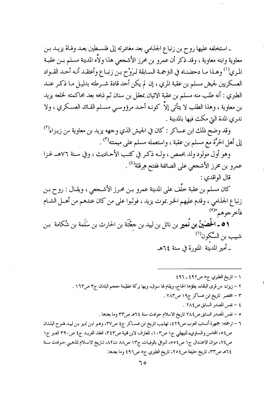 1 - تاريخ الطبري ج5 ص492 - 496. 2 - زيزاء: من قرى البلقاءن يطؤها الحاج، ويقام لها سوق، وبها بركة عظيمة معجم البلدان ج3 ص163. 3 - مختصر تاريخ ابن عاسكر ج19 ص283. 4 - نفس المصدر السابق ص284. 5 - نفس المصدر السابق ص284 تاريخ الإسلام حوادث سنة 64هـ ص33 وما بعدها. 6 - ترجمته: جمهرة أنساب العرب ص429، تهذيب تاريخ ابن عساكر ج4 ص37، وهو ابن نمير بن لبيد فتوح البلدان ص5، المحاسن والمساوئ للبيهقي ج1 ص103، المعارف لابن قتيبة ص343، العقد الفريد ج4 ص390 العبر ج1 ص74، ميزان الاعتدال ج1 ص554، الوافي بالوفيات ج13 ص88 ت 82، تاريخ الإسلام للذهبي حوادث سنة 64هـ ص33، تاريخ خلفة ص254، تاريخ الطبري ج5 ص496 وما بعدها.
