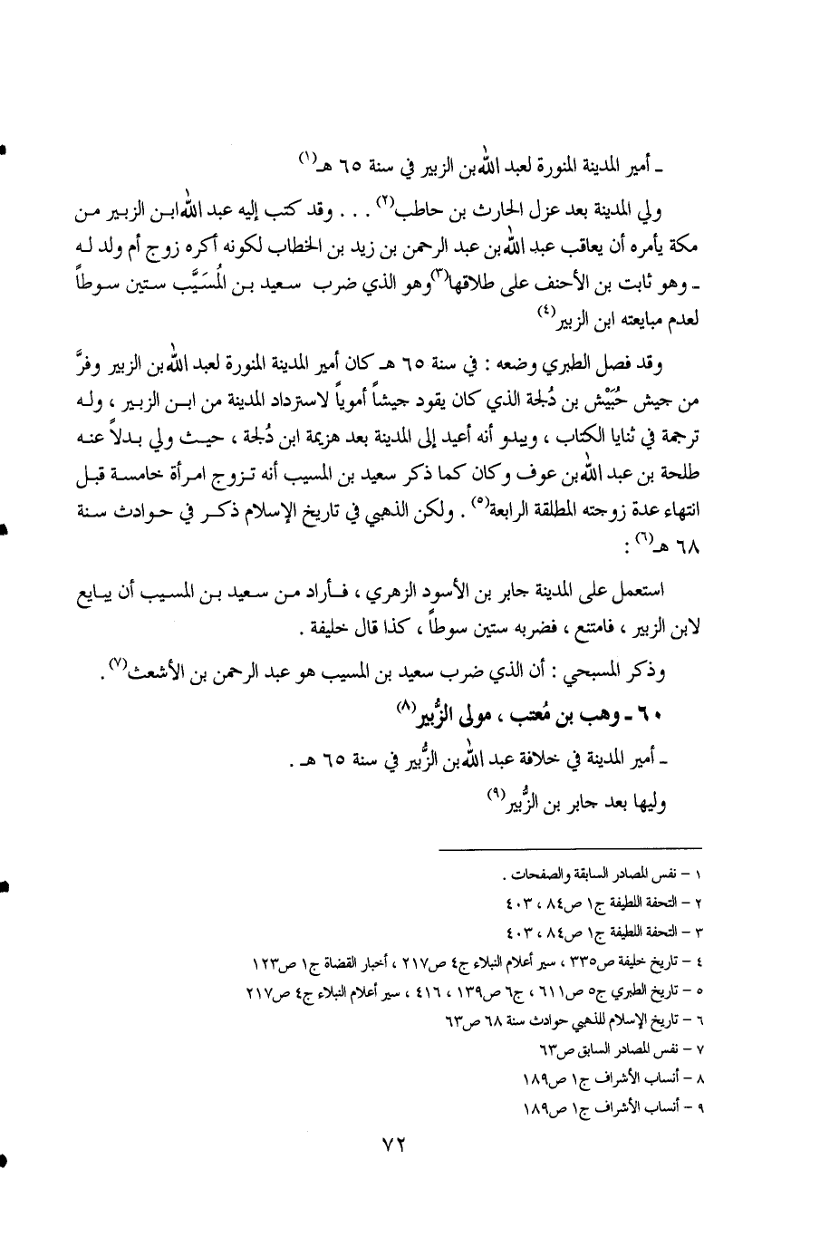 1 - نفس المصادر السابقة والصفحات. 2 - التحفة اللطيفة ج1 ص84، 403. 3 - التحفة اللطيفة ج1 ص84، 403. 4 - تاريخ اخليفة ص335، سير أعلام النبلاء ج4 ص217، أخبار القضاة ج1 ص123. 5 - تاريخ الطبري ج5 ص611، ج6 ص139، 416، سير أعلام النبلاء ج4 ص217. 6 - تاريخ الإسلام للذهبي حوادث سنة 68 ص63. 7 - نفس المصادر السابق ص63. 8 - أنساب الأشراف ج1 ص189. 9 - أنساب الأشراف ج1 ص189.