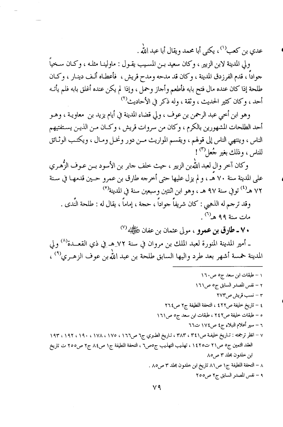 1 - طبقات ابن سعد ج5 ص160. 2 - نفس المصدر السابق ج5 ص161. 3 - نسب قريش ص273. 4 - تاريخ خليفة ص422، التحفة اللطيفة ج2 ص264. 5 - طبقات خليفة ص242، طبقات ابن سعد ج5 ص161. 6 - سير أعلام النبلاء ج4 ص174 ت66. 7 - انظر ترجمته: تاريخ خليفة ص341، 383، تاريخ الطبري ج6 ص166، 175، 178، 190، 192، 193، العقد الثمين ج5 ص21 ت1425، تهذيب التهذيب ج5 ص6، التحفة اللطيفة ج1 ص84 ج2 ص255 ت تاريخ ابن خلدون مجلد 3 ص85. 8 - التحفة اللطيفة ج1 ص81 تاريخ ابن خلدون مجلد 3 ص85. 9 - نفس المصدر السابق ج2 ص255.