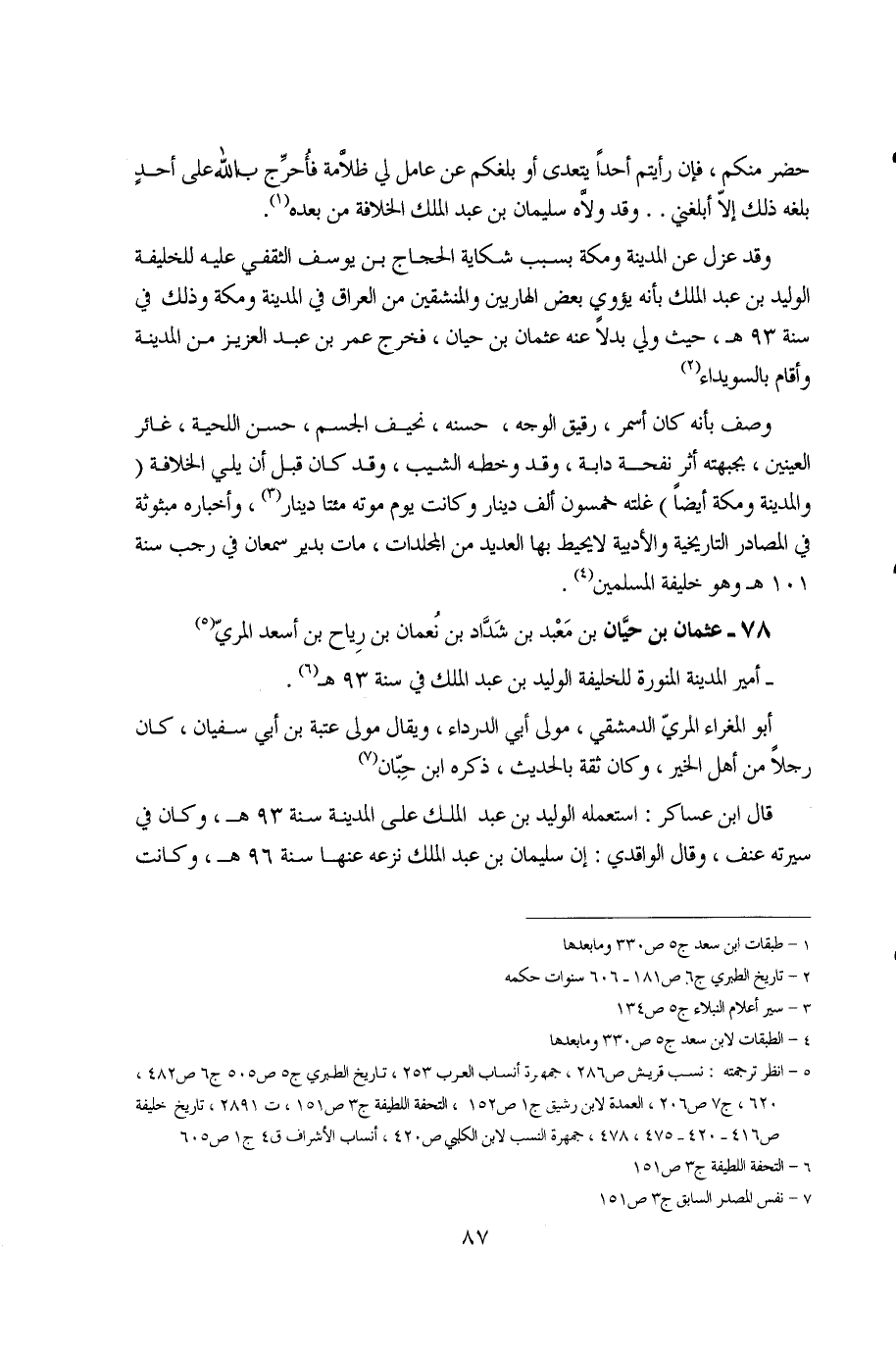1 - طبقات ابن سعد ج5، ص330 وما بعدها. 2 - تاريخ الطبري ج6 ص181 - 606 سنوات حكمه. 3 - سير أعلام النبلاء ج5 ص134. 4 - الطبقات لابن سعد ج5 ص330 وما بعدها. 5 - انظر ترجمته: نسب قريش ص286، جمهرة أنساب العرب 253، تاريخ الطبري ج5 ص505 ج6 ص482، 620، ج7 ص206، العمدة لابن رشييق ج1 ص152، التحفة اللطيفة ج3 ص151، ت2891، تاريخ خليفة ص416 - 420 - 475، 478، جمهرة النسب لابن الكلبي ص420، أنساب الأِراف ق4 ج1 ص605. 6 - التحفة اللطيفة ج3 ص151. 7 - نفس المصدر السابق ج3 ص151.