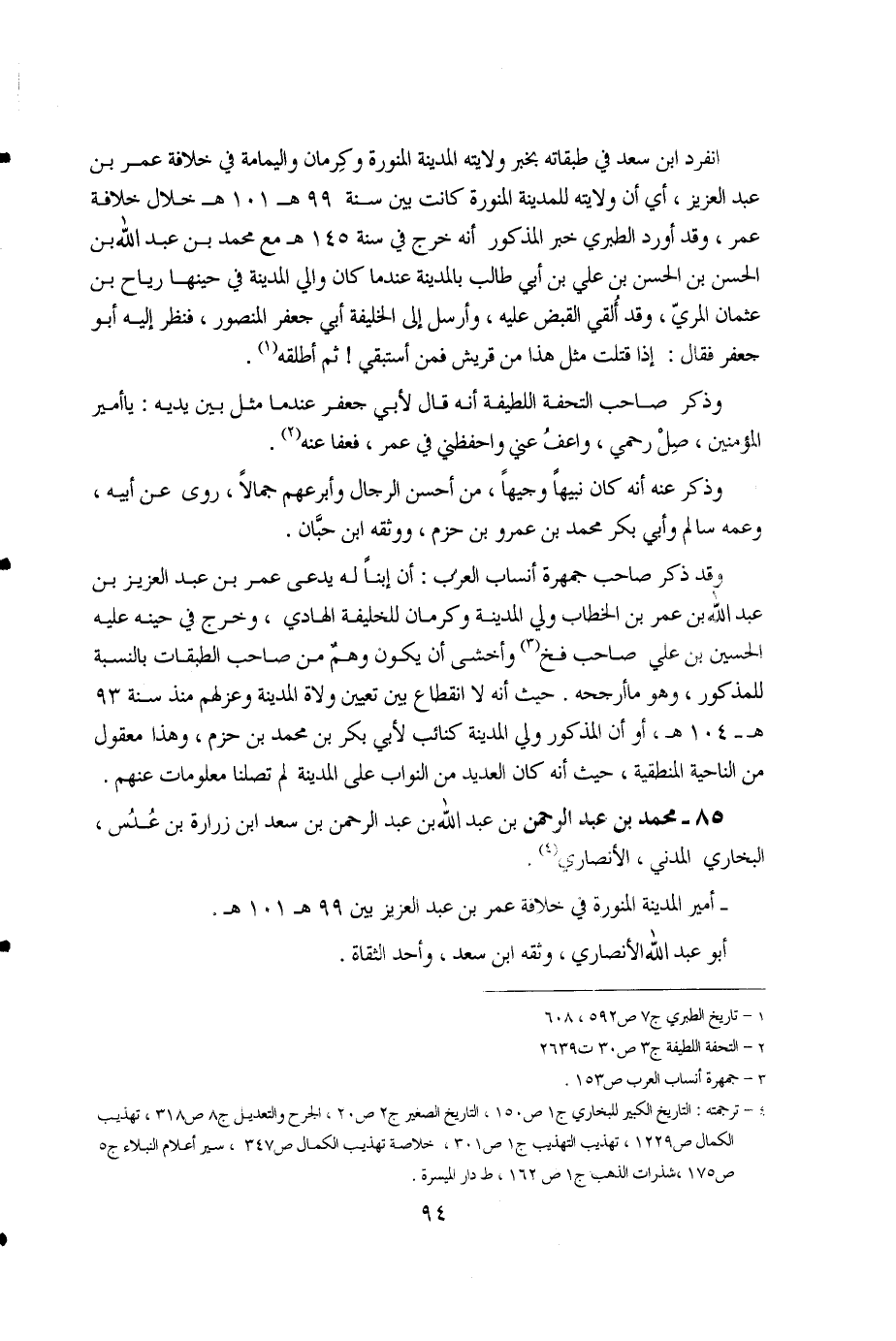 85 - محمد بن عبد الرحمن بن عبد الله بن عبد الرحمن بن سعد بن زرارة بن عُدُس، النجاري المدني، الأنصاري (4).