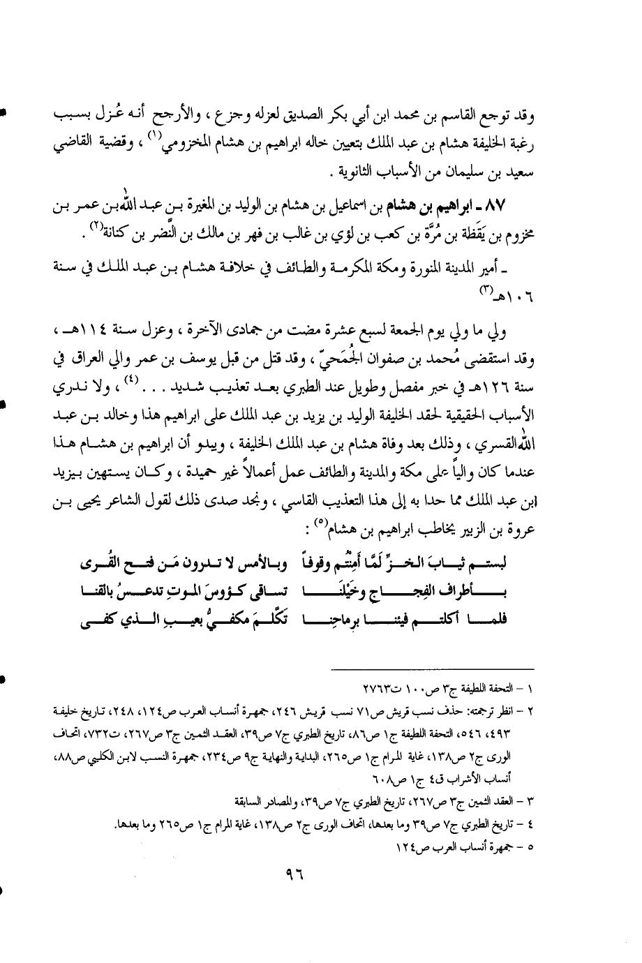 87 - إبراهيم بن هشام بن إسماعيل بن هشام بن الوليد بن المغير بن عبد الله بن عمر بن مخزوم بن يَقَظة بن مُرَّة بن كعب بن لؤي بن غالب بن فهر بن مالك بن النضر بن كنانة (2).