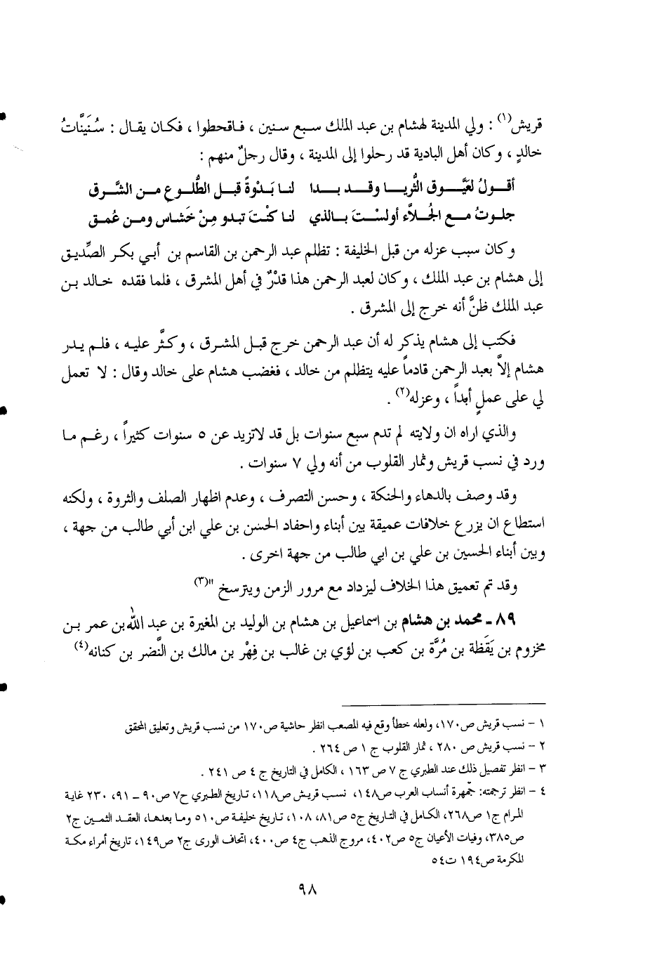 1 - نسب قريش ص170، ولعله خطأ وقع في المصعب انظر حاشية ص170 من نسب قريش وتعليق المحقق. 2 - نسب قريش ص280، ثمار القلوب ج1 ص264. 3 - انظر تفصيل ذلك عند الطبري ج7 ص163، الكامل في التاريخ ج4 ص241. 4 - انظر ترجمته: جمهرة أنساب العرب ص148، نسب قريش ص118، تاريخ الطبري ح7 ص90 - 91، 230 غاية المرام ج1 ص268، الكامل في التاريخ ج5 ص81، 108، تاريخ خليفة ص510 وما بعدها، العقد الثمين ج2 ص385، وفيات الأعيان ج5 ص2، 402، مروج الذهب ج4 ص400، اتحاف الورى ج2 ص149، تاريخ أمراء مكة المكرمة ص194 ت54.