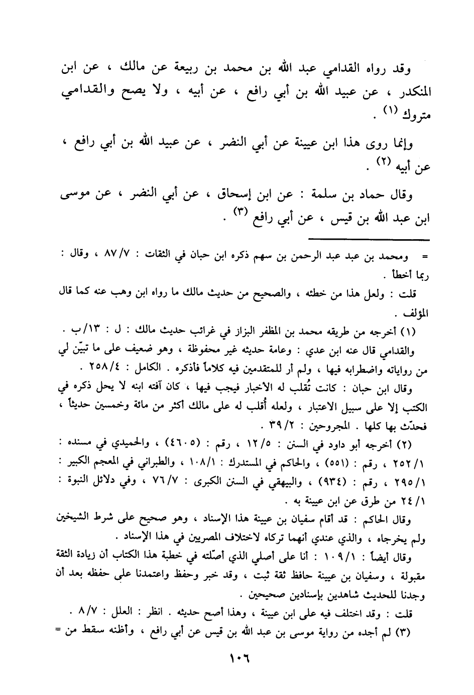 وَقَدْ رَوَاهُ الْقُدَامِيُّ عَبْدُ اللَّهِ بْنُ مُحَمَّدِ بْنِ رَبِيعَةَ عَنْ مَالِكٍ عَنِ ابْنِ الْمُنْكَدِرِ عَنْ عُبَيْدِ اللَّهِ بْنِ أَبِي رَافِعٍ عَنْ أَبِيهِ وَلا يَصِحُّ وَالْقُدَامِيُّ مَتْرُوكٌ