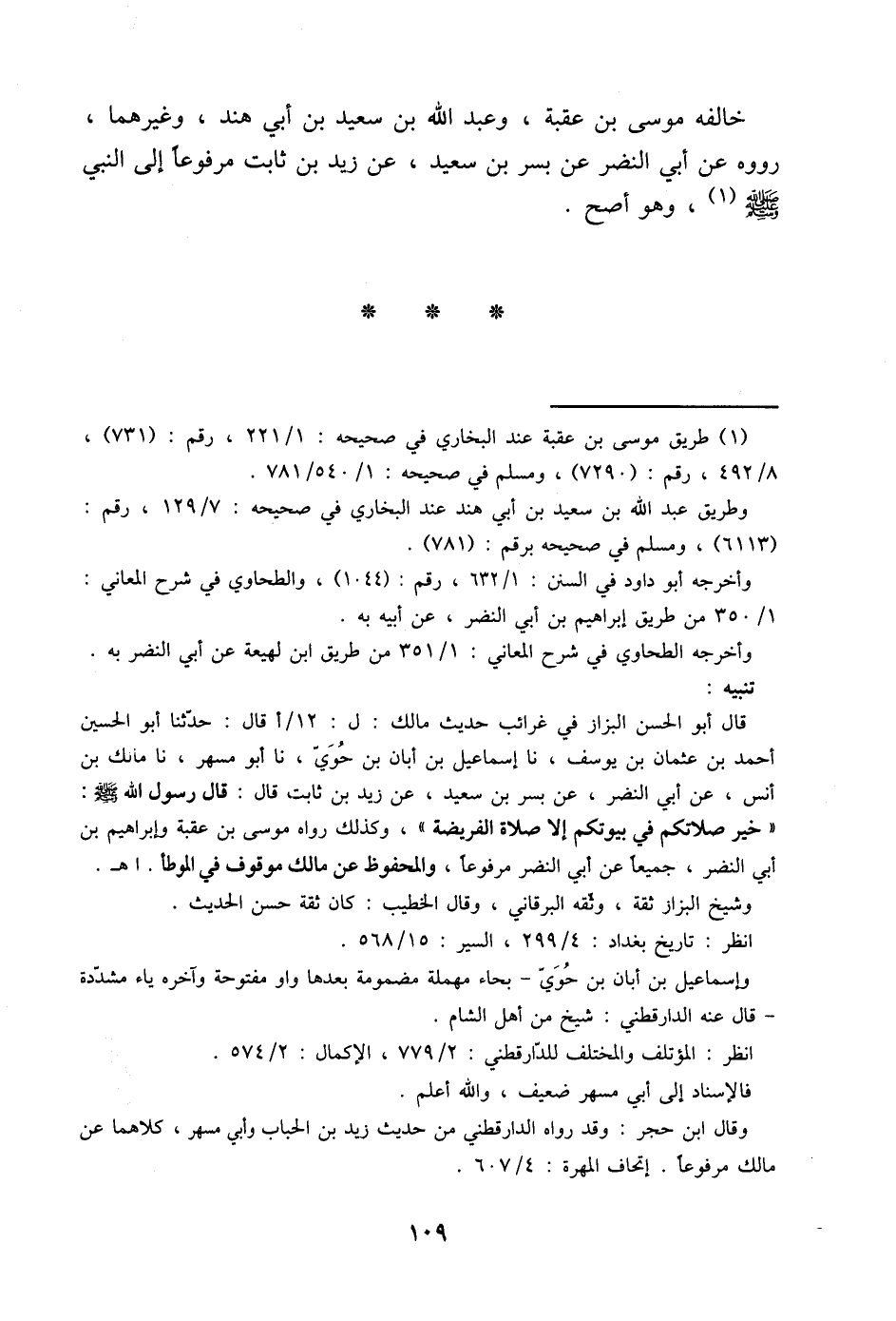 خَالَفَهُ مُوسَى بْنُ عُقْبَةَ وَعَبْدُ اللَّهِ بْنُ سَعِيدِ بْنِ أَبِي هِنْدٍ وَغَيْرُهُمَا رَوَوْهُ عَنْ أَبِي النَّضْرِ عَنْ بُسْرِ بْنِ سَعِيدٍ عَنْ زَيْدِ بْنِ ثَابِتٍ مَرْفُوعًا إِلَى النَّبِيِّ صَلَّى اللَّهُ عَلَيْهِ وَسَلَّمَ وَهُوَ أَصَحُّ