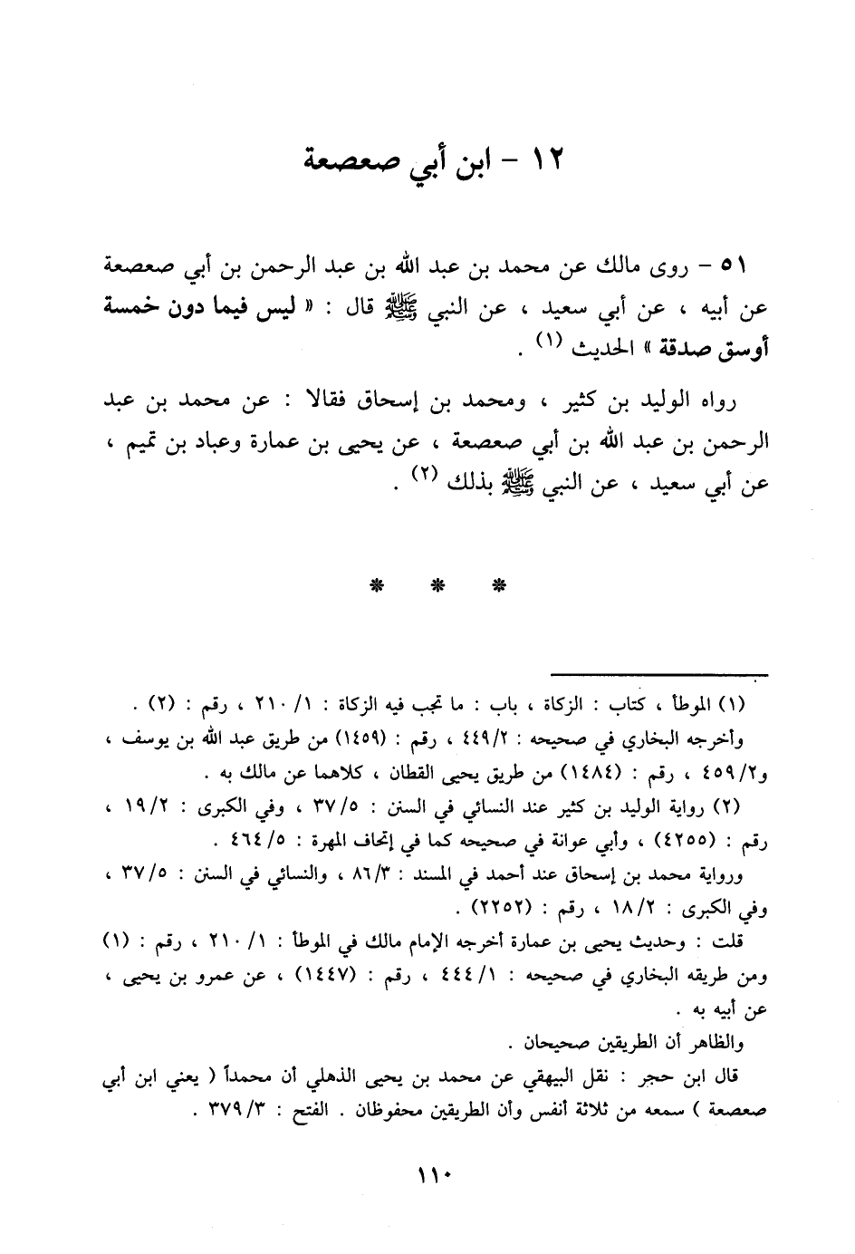 51 - رَوَى مَالِكٌ عَنْ مُحَمَّدِ بْنِ عَبْدِ اللَّهِ بْنِ عَبْدِ الرَّحْمَنِ بْنِ أَبِي صَعْصَعَةَ عَنْ أَبِيهِ عَنْ أَبِي سَعِيدٍ عَنِ النَّبِيِّ صَلَّى اللَّهُ عَلَيْهِ وَسَلَّمَ قَالَ (لَيْسَ فِيمَا دُونَ خَمْسَةِ أَوْسُقٍ صَدَقَةٌ) الْحَدِيثَ