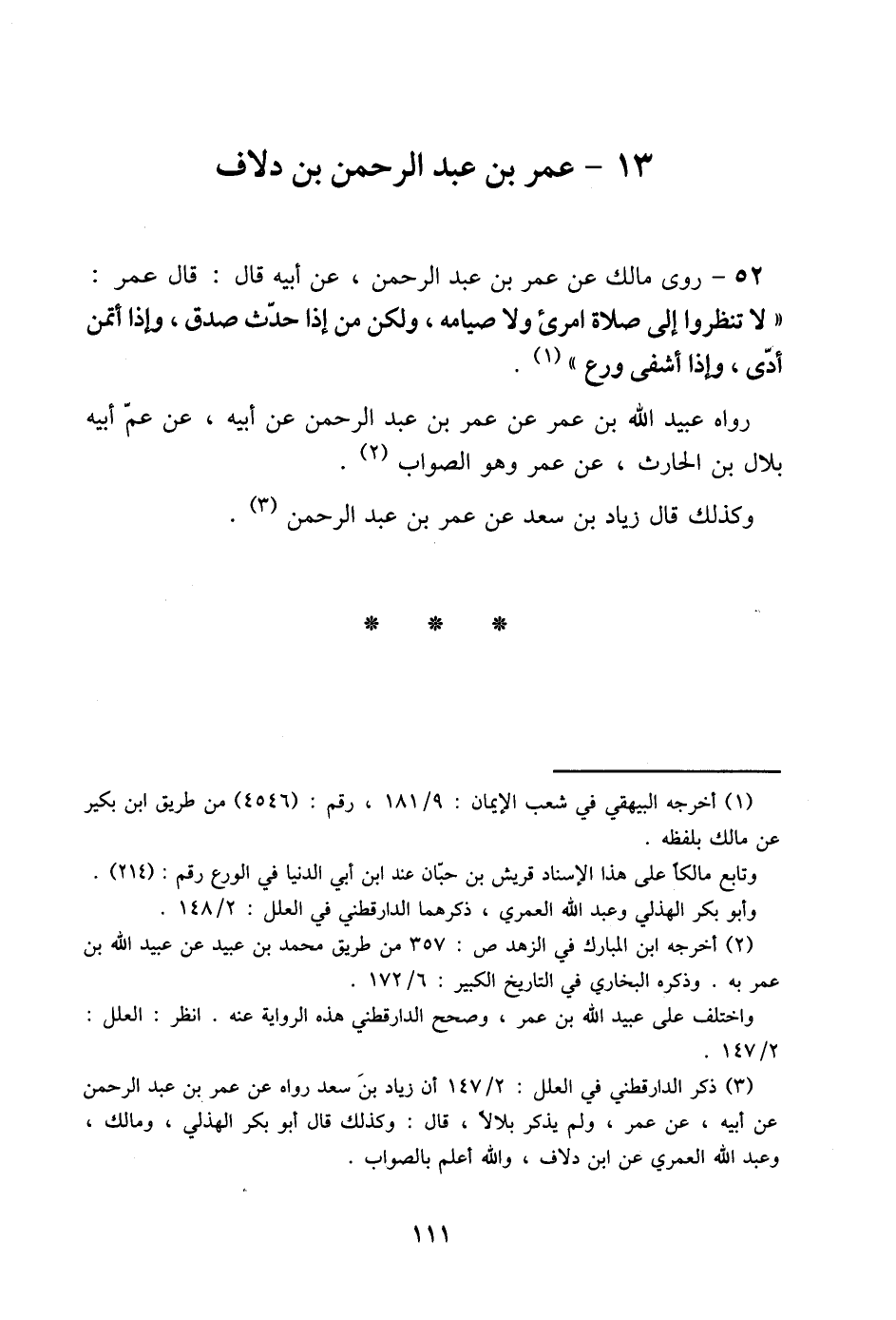 52 - رَوَى مَالِكٌ عَنْ عُمَرَ بْنِ عَبْدِ الرَّحْمَنِ عَنْ أَبِيهِ قَالَ قَالَ عُمَرُ (لَا تَنْظُرُوا إِلَى صَلاةِ امْرِئٍ وَلا صِيَامِهِ وَلَكِنْ مَنْ إِذَا حدث صدق وَإِذا أتمن أَدَّى وَإِذَا أَشْفَى وَرِعَ)