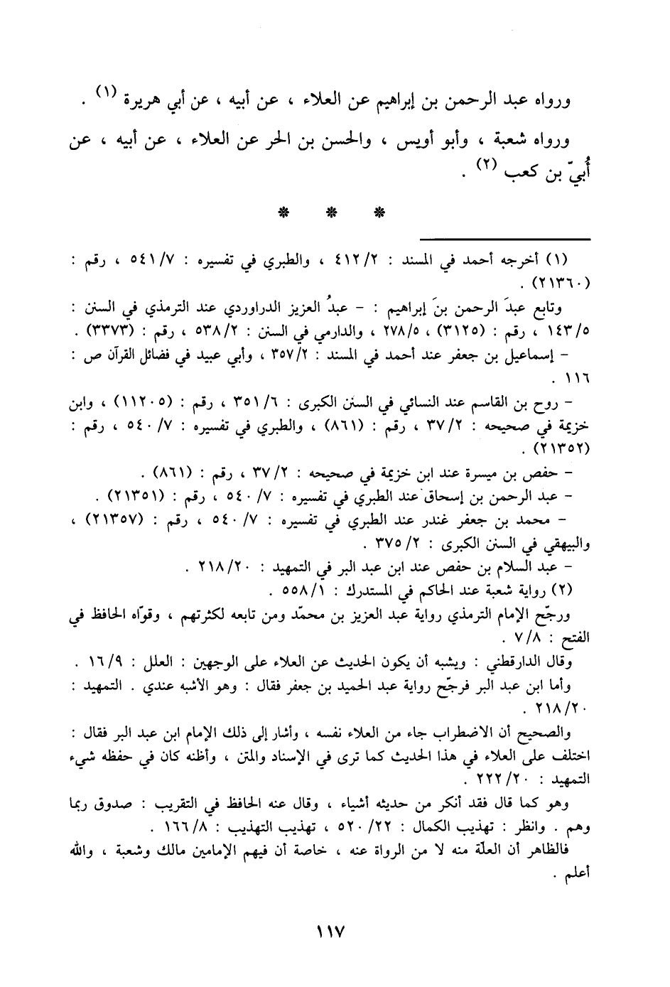 وَرَوَاهُ شُعْبَةُ وَأَبُو أُوَيْسٍ وَالْحَسَنُ بْنُ الْحُرِّ عَنِ الْعَلاءِ عَنْ أَبِيهِ عَنْ أُبَيِّ بْنِ كَعْبٍ