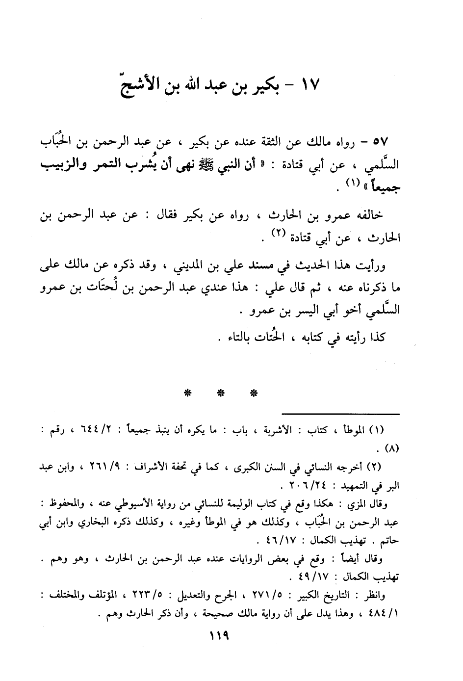 57 - رَوَاهُ مَالِكٌ عَنِ الثِّقَةِ عِنْدَهُ عَنْ بُكَيْرٍ عَنْ عَبْدِ الرَّحْمَنِ بْنِ الْحُبَابِ السُّلَمِيِّ عَنْ أَبِي قَتَادَةَ (أَنَّ النَّبِيَّ صَلَّى اللَّهُ عَلَيْهِ وَسَلَّمَ نَهَى أَنْ يُشْرَبَ التَّمْرُ وَالزَّبِيبُ جَمِيعًا) خَالَفَهُ عَمْرُو بْنُ الْحَارِثِ رَوَاهُ عَنْ بُكَيْرٍ فَقَالَ عَنْ عَبْدِ الرَّحْمَنِ بْنِ الْحَارِثِ عَنْ أَبِي قَتَادَةَ