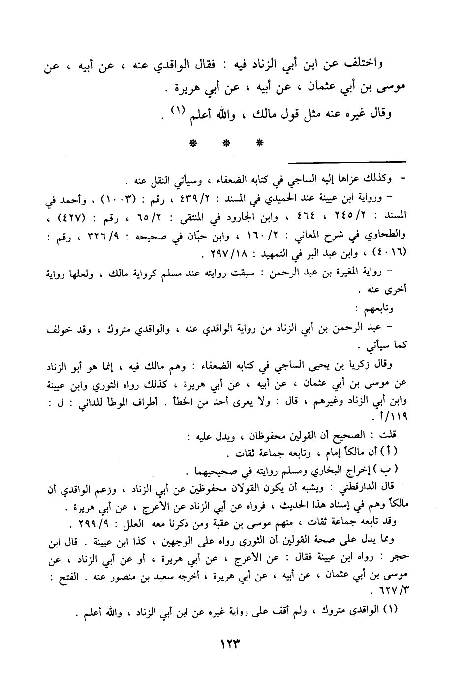 وَاخْتُلِفَ عَنِ ابْنِ أَبِي الزِّنَادِ فِيهِ فَقَالَ الْوَاقِدِيُّ عَنْهُ عَنْ أَبِيهِ عَنْ مُوسَى بْنِ أَبِي عُثْمَانَ عَنْ أَبِيهِ عَنْ أَبِي هُرَيْرَةَ