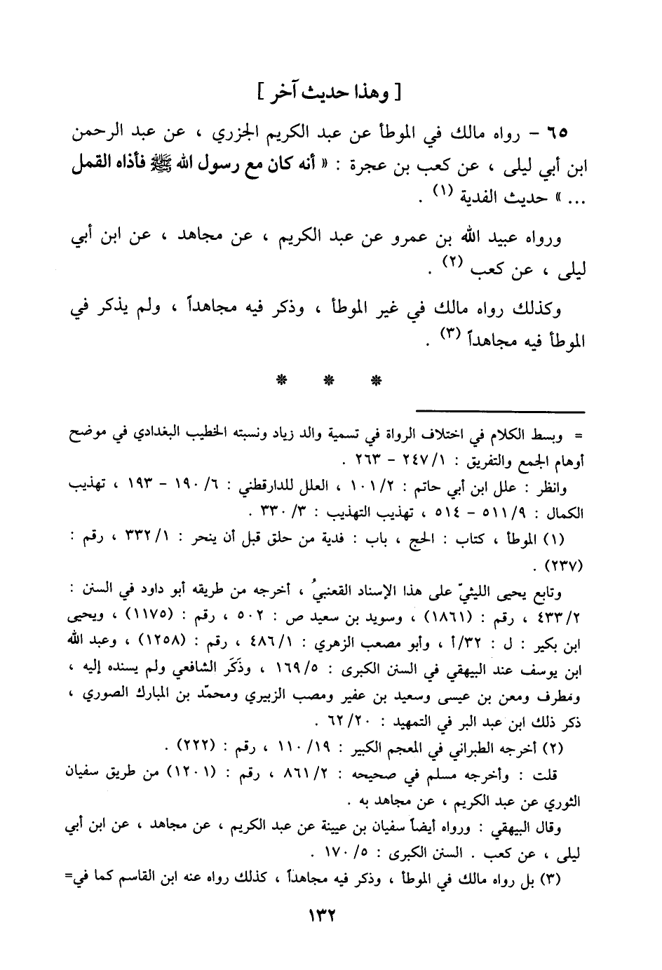 65 - رَوَاهُ مَالِكٌ فِي الْمُوَطَّإِ عَنْ عَبْدِ الْكَرِيمِ الْجَزَرِيِّ عَنْ عَبْدِ الرَّحْمَنِ ابْن أَبِي لَيْلَى عَنْ كَعْبِ بْنِ عُجْرَةَ (أَنَّهُ كَانَ مَعَ رَسُولِ اللَّهِ صَلَّى اللَّهُ عَلَيْهِ وَسَلَّمَ فَأَذَاهُ الْقَمْلُ) حَدِيثَ الْفِدْيَةِ