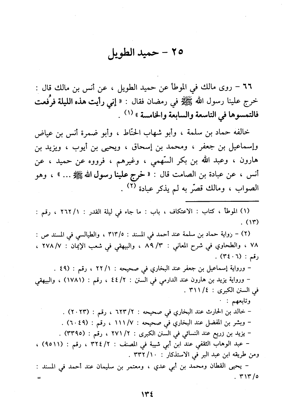 66 - رَوَى مَالِكٌ فِي الْمُوَطَّإِ عَنْ حُمَيْدٍ الطَّوِيلِ عَنْ أَنَسِ بْنِ مَالِكٍ قَالَ خَرَجَ عَلَيْنَا رَسُولُ اللَّهِ صَلَّى اللَّهُ عَلَيْهِ وَسَلَّمَ فِي رَمَضَانَ فَقَالَ (إِنِّي رَأَيْتُ هَذِهِ اللَّيْلَةَ فَرُفِعَتْ فَالْتَمِسُوهَا فِي التَّاسِعَةِ وَالسَّابِعَةِ وَالْخَامِسَةِ)