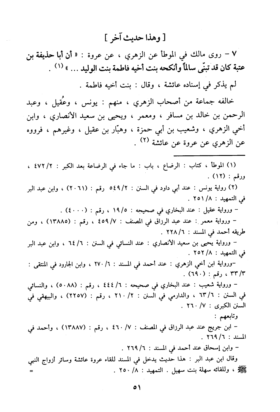 7 - رَوَى مَالِكٌ فِي الْمُوَطَّإِ عَنِ الزُّهْرِيِّ عَنْ عُرْوَةَ (أَنَّ أَبَا حُذَيْفَةَ بْنَ عُتْبَةَ كَانَ قَدْ تَبَنَّى سَالِمًا وَأَنْكَحَهُ بِنْتَ أَخِيهِ فَاطِمَةَ بِنْتَ الْوَلِيدِ)