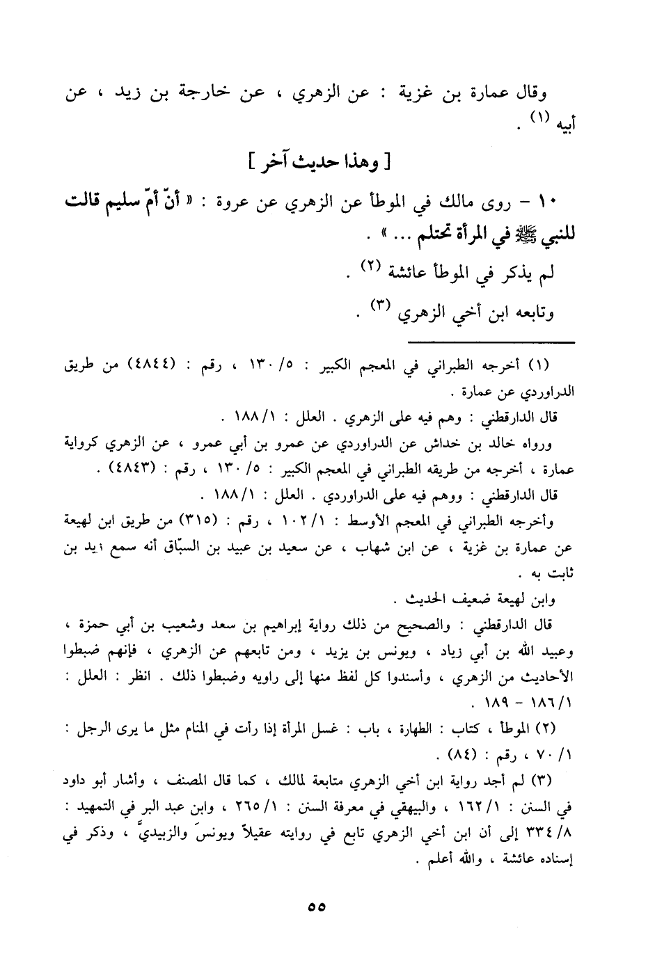 1 - رَوَى مَالِكٌ فِي الْمُوَطَّإِ عَنِ الزُّهْرِيِّ عَنْ عُرْوَةَ (أَنَّ أُمَّ سُلَيْمٍ قَالَتْ لِلنَّبِيِّ صَلَّى اللَّهُ عَلَيْهِ وَسَلَّمَ فِي الْمَرْأَةِ تَحْتَلِمُ)
