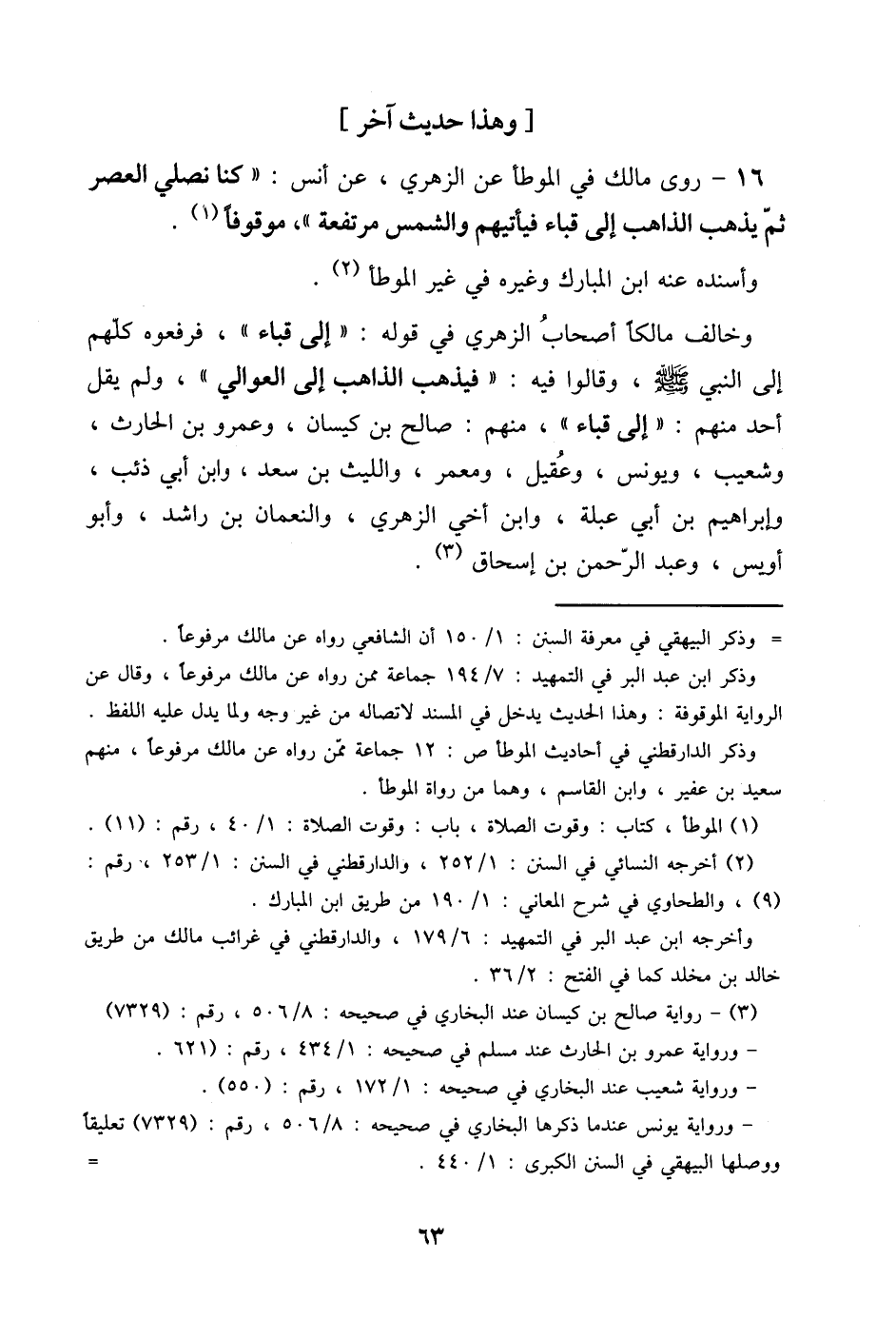 16 - رَوَى مَالِكٌ فِي الْمُوَطَّإِ عَنِ الزُّهْرِيِّ عَنْ أَنَسٍ (كُنَّا نُصَلِّي الْعَصْرَ ثُمَّ يَذْهَبُ الذَّاهِبُ إِلَى قُبَاءَ فَيَأْتِيهِمْ وَالشَّمْسُ مُرْتَفِعَةٌ) مَوْقُوفًا