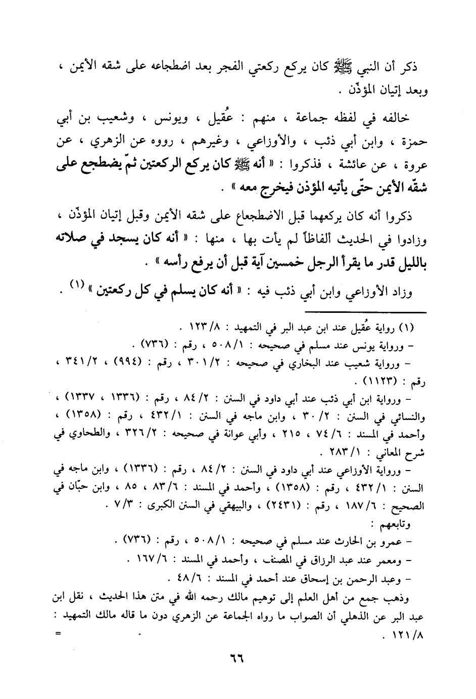 خَالَفَهُ فِي لَفْظِهِ جَمَاعَةٌ مِنْهُمْ عُقَيْلٌ وَيُونُسُ وَشُعَيْبُ بْنُ أَبِي حَمْزَةَ وَابْنُ أَبِي ذِئْبٍ وَالأَوْزَاعِيُّ وَغَيْرُهُمْ رَوَوْهُ عَنِ الزُّهْرِيِّ عَنْ عُرْوَةَ عَنْ عَائِشَةَ فَذَكَرُوا (أَنَّهُ صَلَّى اللَّهُ عَلَيْهِ وَسَلَّمَ كَانَ يَرْكَعُ الرَّكْعَتَيْنِ ثُمَّ يَضْطَجِعُ عَلَى شِقِّهِ الأَيْمَنِ حَتَّى يَأْتِيَهُ الْمُؤَذِّنُ فَيَخْرُجُ مَعَهُ)