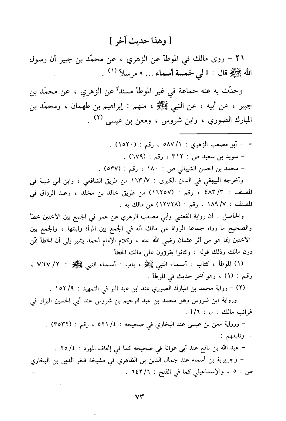 21 - رَوَى مَالِكٌ فِي الْمُوَطَّإِ عَنِ الزُّهْرِيِّ عَنْ مُحَمَّدِ بْنِ جُبَيْرٍ أَنَّ رَسُولَ اللَّهِ صَلَّى اللَّهُ عَلَيْهِ وَسَلَّمَ قَالَ (لِي خَمْسَةُ أَسْمَاءَ) مُرْسَلا