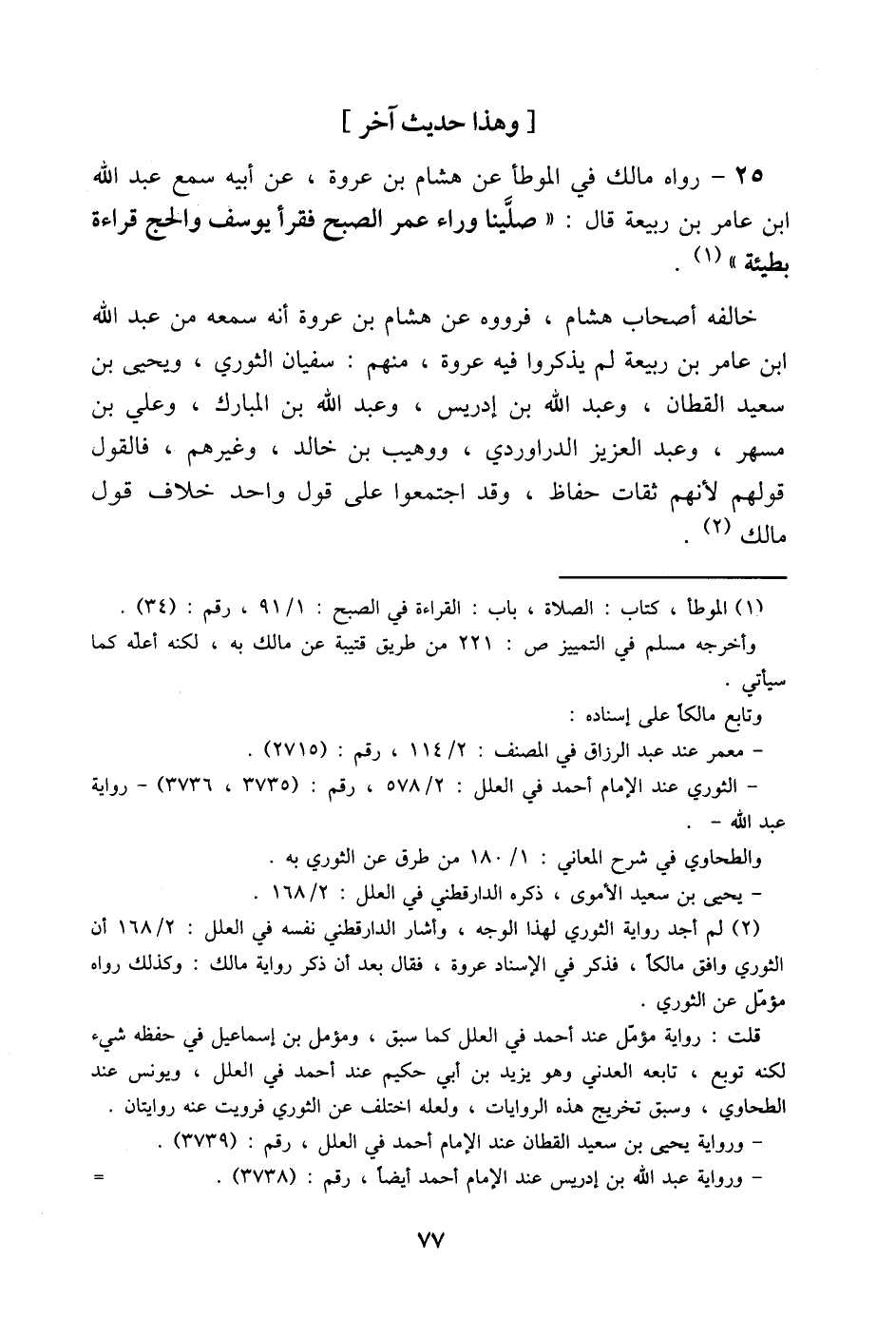 25 - رَوَاهُ مَالِكٌ فِي الْمُوَطَّإِ عَنْ هِشَامِ بْنِ عُرْوَةَ عَنْ أَبِيهِ سَمِعَ عبد الله ابْن عَامِرِ بْنِ رَبِيعَةَ قَالَ (صَلَّيْنَا وَرَاءَ عُمَرَ الصُّبْح فَقَرَأَ يُوسُف وَالْحج قِرَاءَةً بَطِيئَةً)